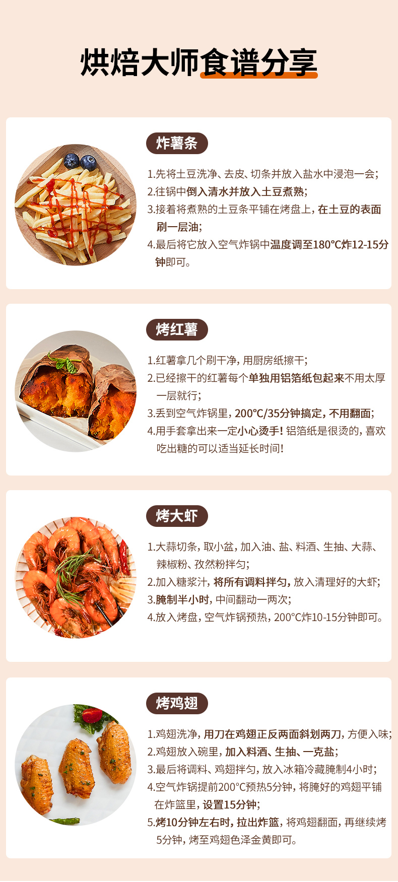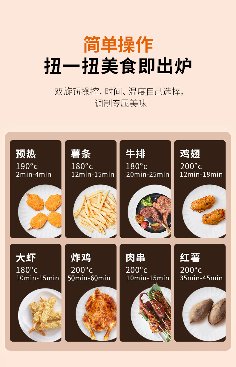 空气炸锅适合烹饪各种肉类、薯条、蛋挞(某宝上可直接买坯子 蛋液)。也可加热买来的外卖熟食,如 披萨、香肠、猪蹄、面包片类之类的,还是很方便的,也是厨房中实用比较高的厨具。