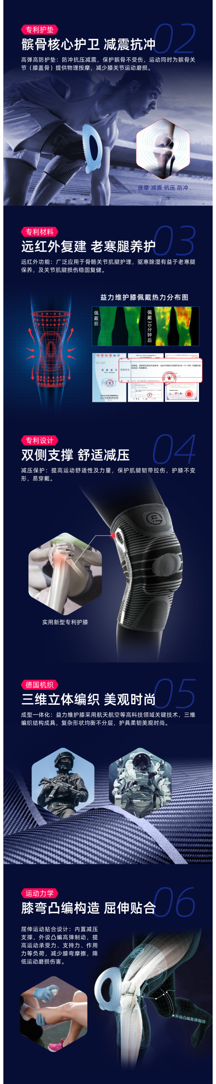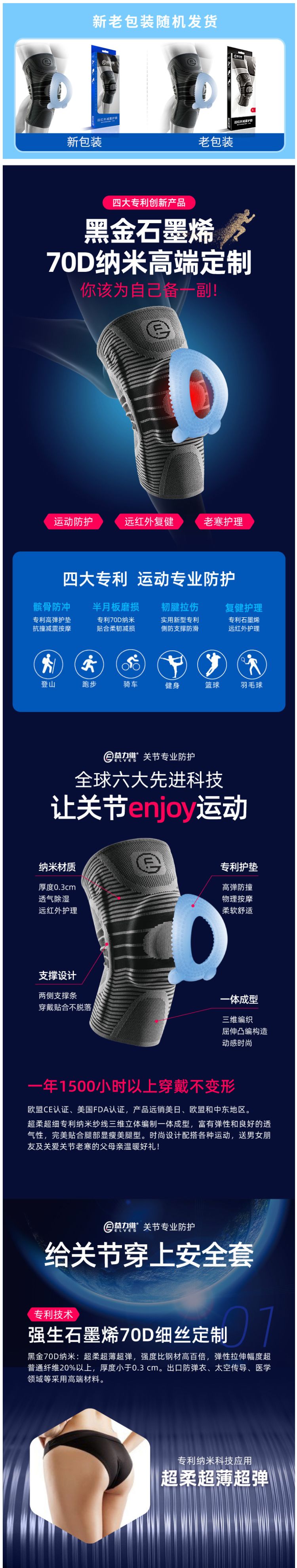 这款益力维 石墨烯远红外护膝 ,拥有四项专利认证,高端定制,选用新型石墨烯纳米材料,高密度三维编织技术,选用石墨烯70D超细长丝双编,柔软舒适,高强度高弹力,整体受力均匀,不分层,增强关节屈伸稳定性及韧带肌腱保护,护膝纱线中富含负离子远红外,可以促进循环,排酸减疲,驱寒除湿等,养护关节;