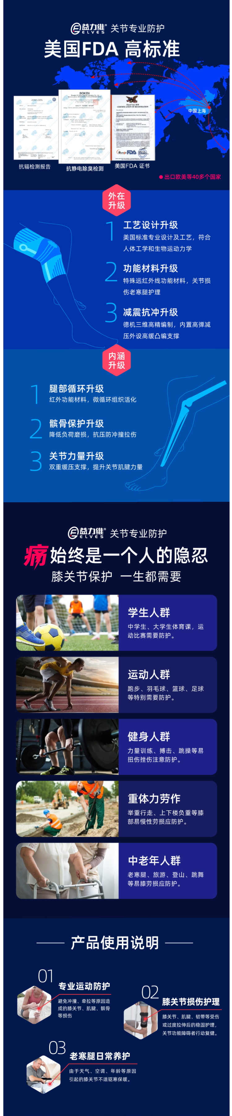 美国FDA标准,专业运动防护,适合关节损伤复健、重体力劳作防护、运动健身防护等。这款护膝髌骨部分采用高弹热塑衬垫,减震抗冲击,两侧韧带高弹支撑条,避免韧带损伤,远红外负离子有益关节,老寒腿保养等。