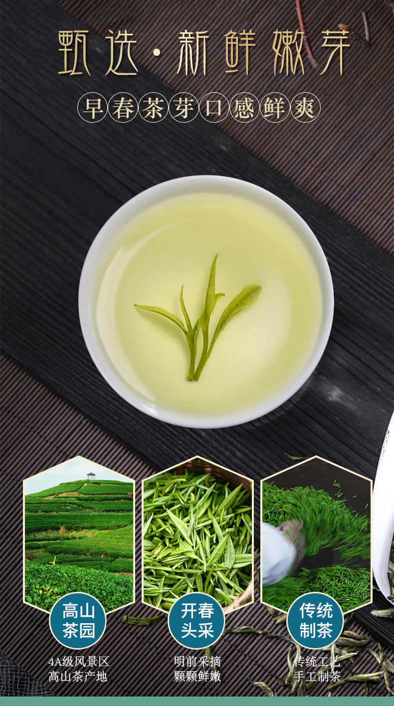 这款云雾绿茶 2021年雨前头采,芽叶鲜嫩饱满,传统百年贡茶技法手工制茶,条索蜷曲、细长均匀,茶汤清澈明亮、鲜爽回甘,浓郁豆香,叶底柔嫩鲜活,整体明亮。规格为250g*2罐,精美礼盒包装,同时也带礼袋,送人也倍有面。