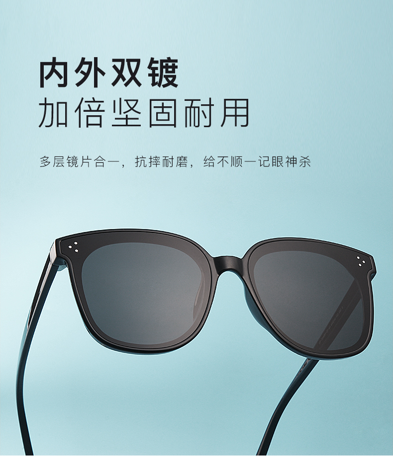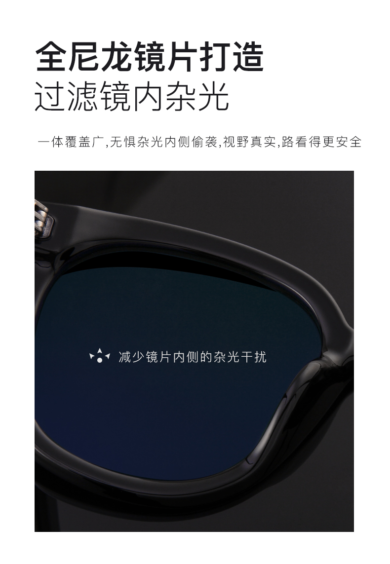 这款经典黑超太阳镜,一体式镜面设计,防护UV400,有效阻隔99%有害紫外线。全镜片制框,受力轻盈平衡,减少对面部肌肤的下坠感。全尼龙镜片打造,遮光更广更强;多层镜片合一抗摔耐磨,油污轻擦即净。一体式鼻托,配重平衡,减轻鼻梁负担。弧形镜腿,弹性开合,不加头耳,佩戴舒适。