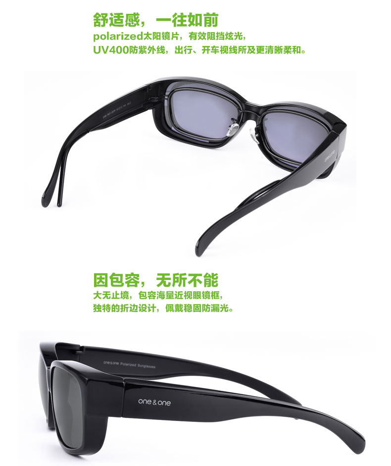 这款oneone 男女偏光太阳镜是套镜,近视眼镜佩戴者可以直接套在近视的光学镜架上,对于近视的朋友来说非常友好。如果是隐形眼镜佩戴者或正常视力都可以直接佩戴,适合各类人群。