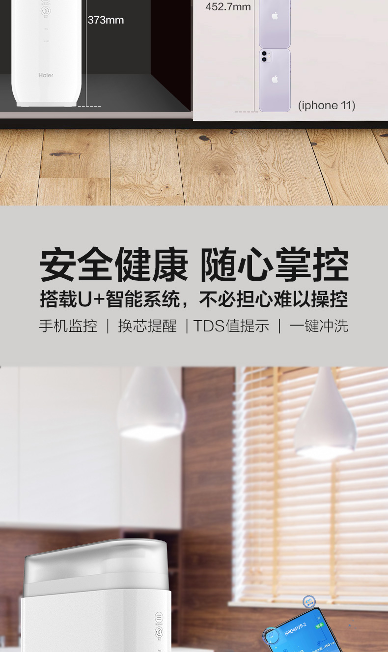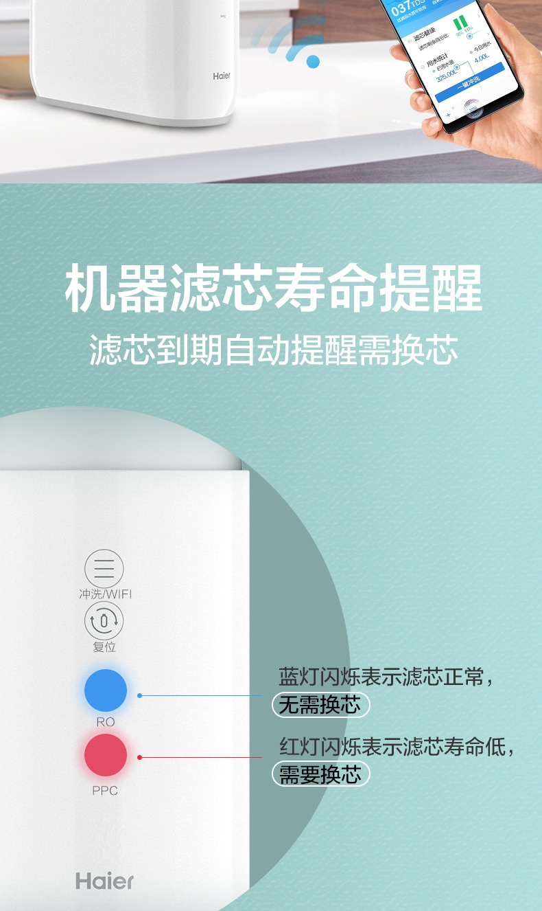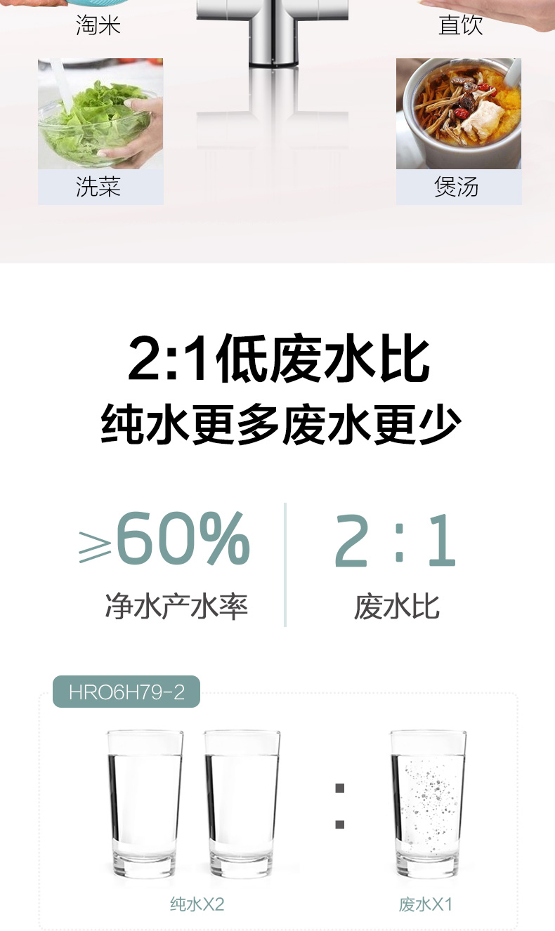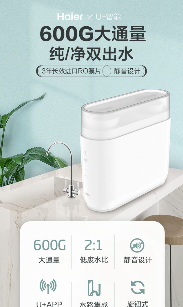 双出水一机两用,矿物质水+纯净水满足家庭多需求应用,废水比为2:1,节约环保。专业降噪技术,48-49分贝,安静不打扰。搭载海尔智慧家庭最新APP“海尔优家”,实时进出水质、滤芯提醒、用水统计、一键换芯,电器变网器开启智慧家庭。