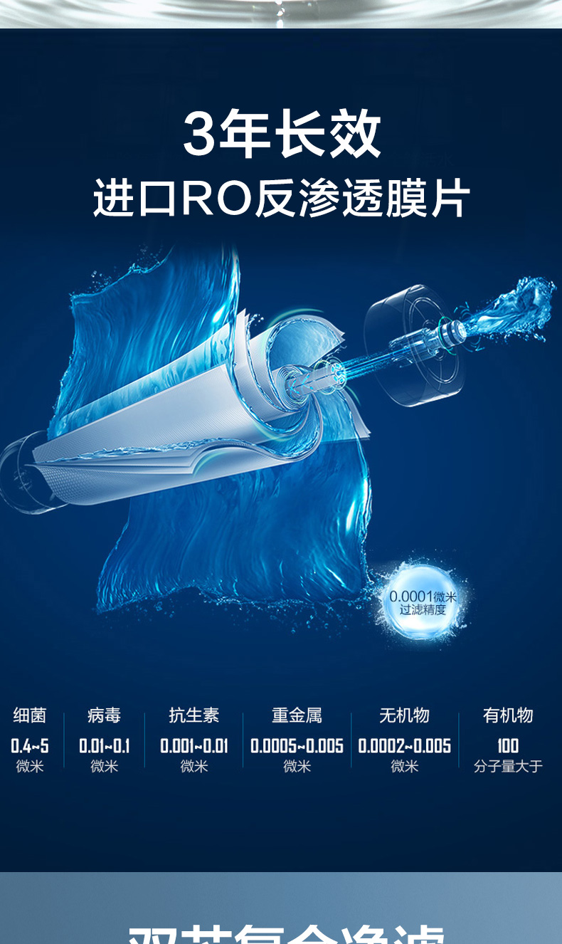 RO反渗透的具体原理是通过加压的方式使水由高浓度流向低浓度,也就是透过RO膜,而RO膜的孔径为0.0001微米,细菌和病毒比它大近5000倍,这样就只有水分子和部分矿物离子能通过,现在的医用、军用净水技术都有RO膜的参与,只不过比民用的级别高很多而已。