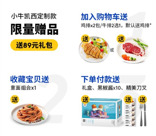这款小牛凯西 原切牛排套餐,累计有29万的4.8分好评,套餐包括:眼肉牛排 130g*3、西冷牛排 130g*5、菲力牛排 130g*2,赠意面190g+煎锅+酱包*10+刀叉*1。