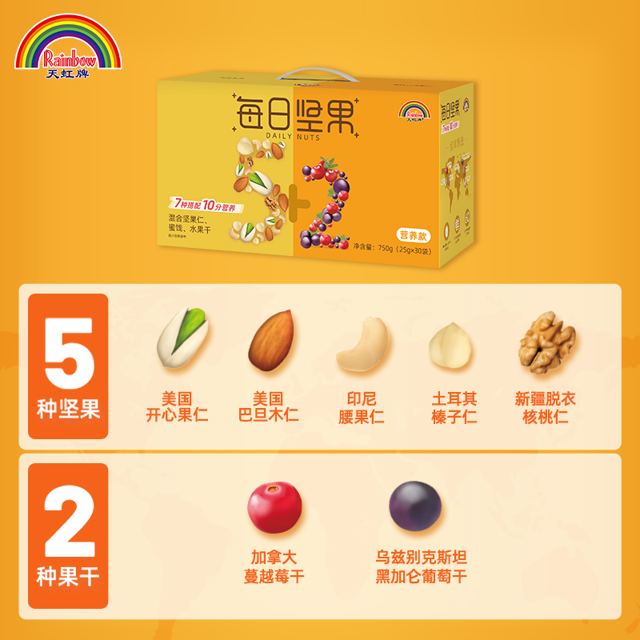 天猫天虹牌食品旗舰店,5月1-5日 天猫55吾折天盛典,¥89.9元 55盛典价,-3元 下单立减,-额外叠加9折 活动官方立减10%,-10元优惠券,=67.91元到手,天虹1958年始创于香港,是一个超60年历史的坚果品牌;这款天虹牌 每日坚果大礼包30袋750g,内含:核桃仁、开心果仁、巴旦木仁、腰果仁、榛子、曼越莓、黑加仑,5+2均衡科学配比,独特的低温烘焙工艺,轻加工,健康更美味。独立锁鲜,干湿分离,营养不串味。