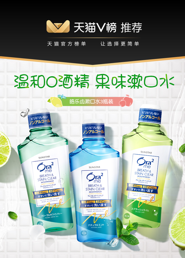 这款ora2皓乐齿 果汁口感漱口水,是像果汁一样口感的漱口水,0酒精成分,温和不刺激。实际规格460ml/瓶,共青柠460ml*2瓶、苹果460ml*1瓶。