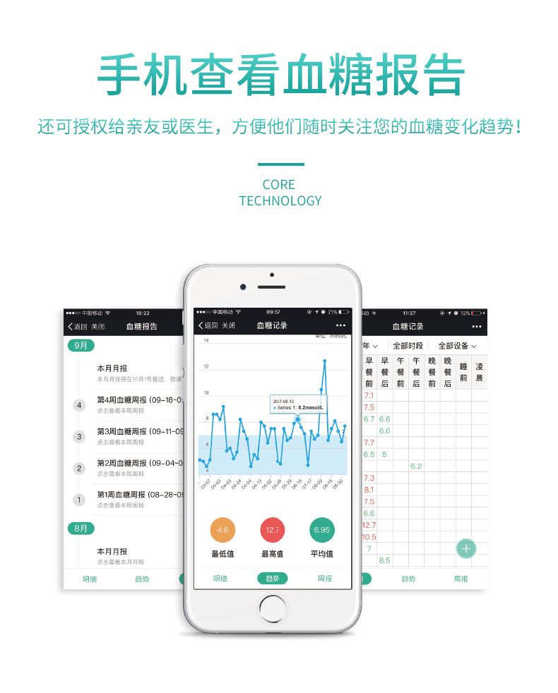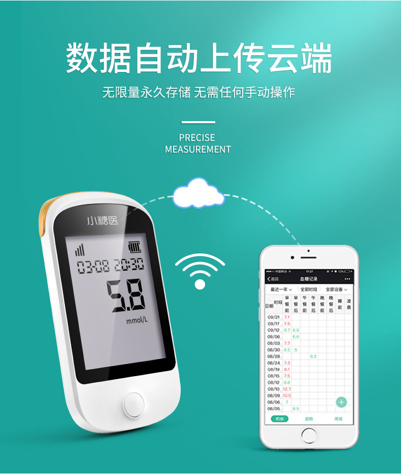 这款智能血糖仪,是院线合作款,精度高,且与普通款相比,多了自动联网,数据自动上传至云端,个人数据永不丢失。测量的血糖结果还能生成图表和报告,随时查看和分析。