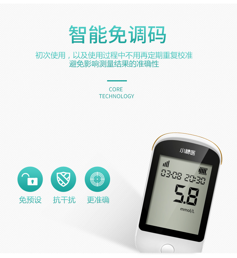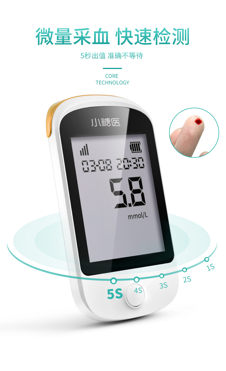使用德国进口免调码四碳电极技术,抗干扰能力强,测量结果精准稳定。采用新型测量芯片,快速分析血液样本,只需5秒,即可准确出值