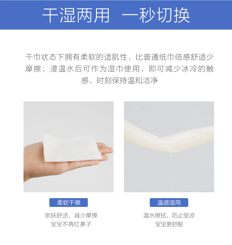 干湿两用,洁净加倍,吸水秒变毛巾,浸上酒精秒变消毒棉片,美容清洁化妆卸妆,一巾解决。柔软厚实不掉絮,无荧光剂,漂白剂,宝宝和妈咪都可以使用。