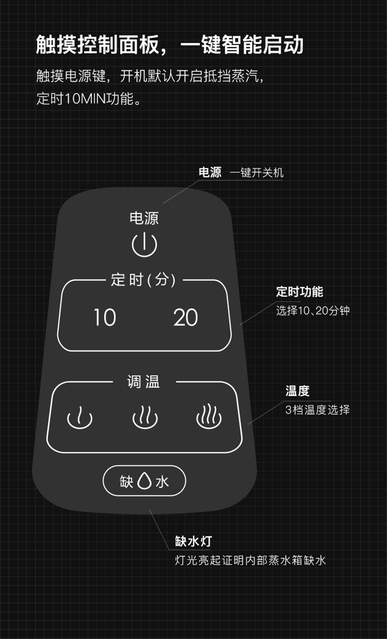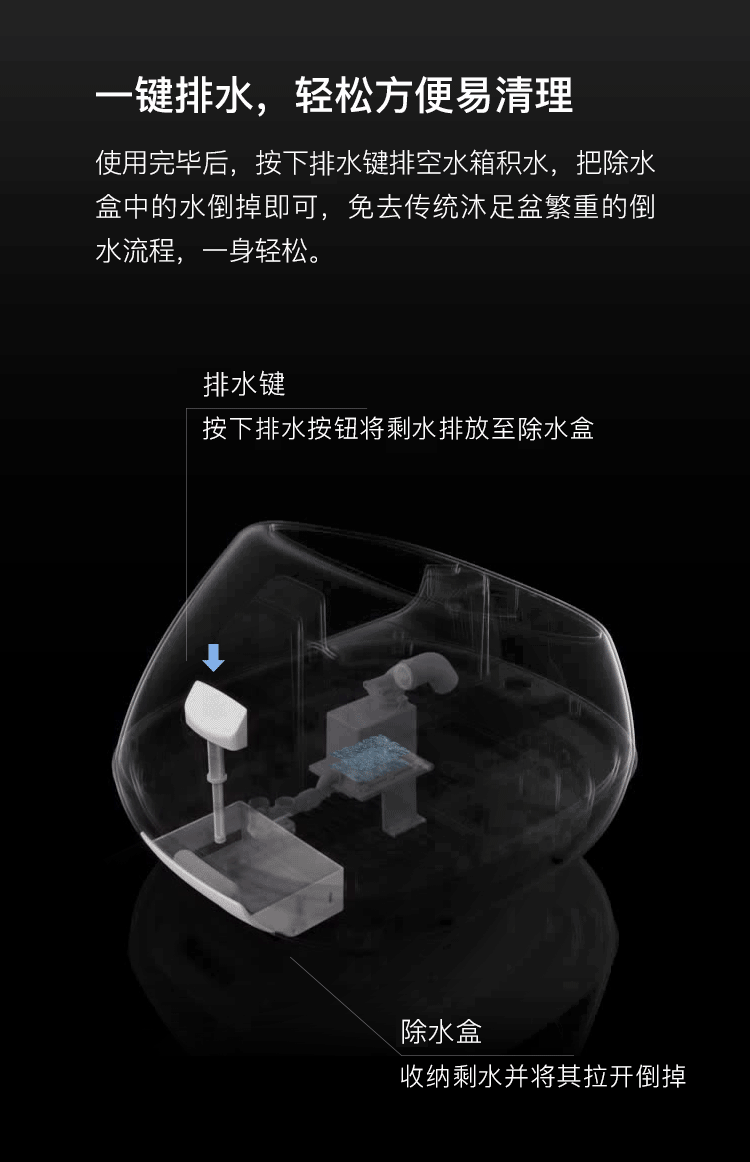 蒸汽熏蒸,免加水、倒水、防沸水倒流溅出水电分离,1分钟快速出汽,边熏蒸边按摩,双腿宛如置于云雾缭绕的温泉中,从脚到身直到心都彻底放松下来了。足不出户,即可享受持久桑拿。水箱容量160ml,一小瓶水可持续使用20分钟,水分蒸发不残留,无需擦脚,落地即走。
