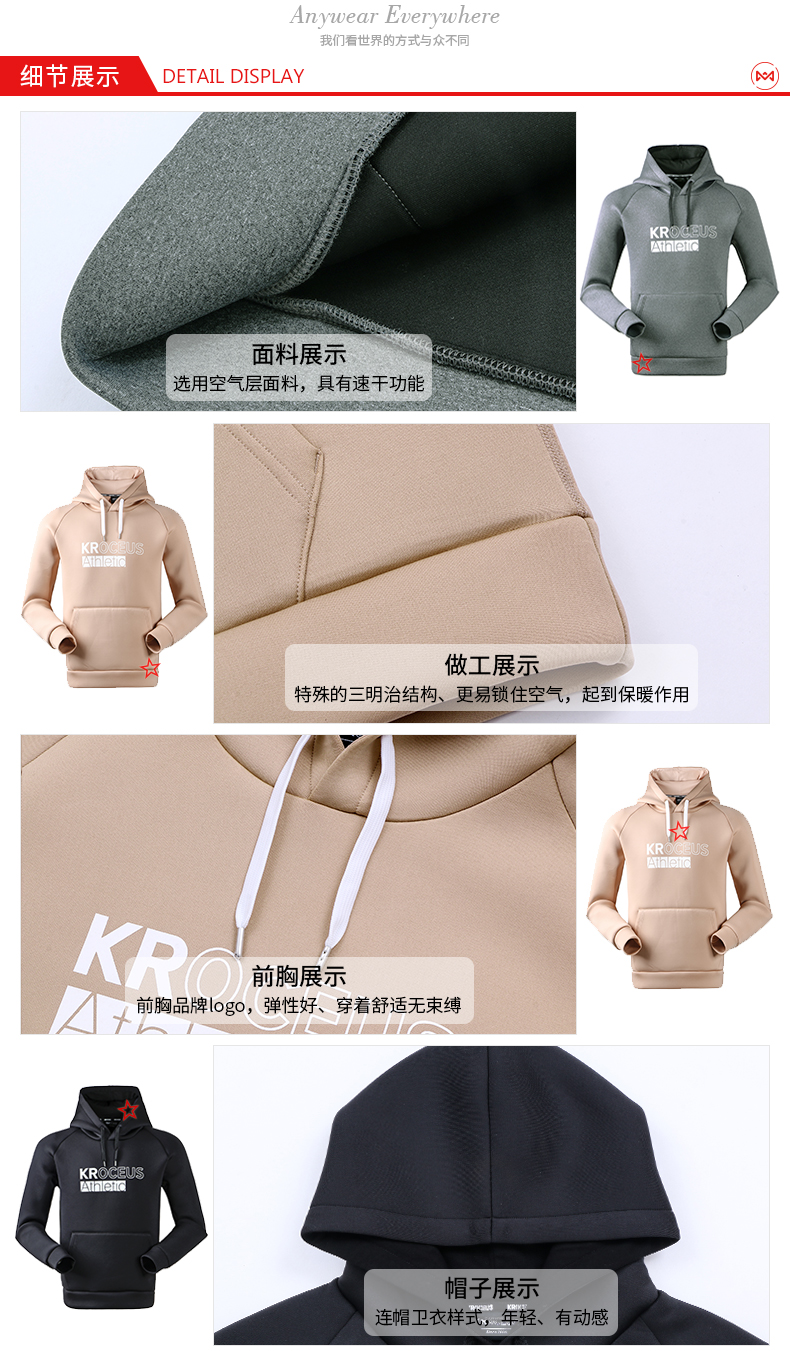 这款地球科学家休闲卫衣,采用加厚空气层面料,由92.4%聚酯纤维+7.4%氨纶弹性纤维组成,特殊的三明治结构,更易锁住空气,能起到保暖锁温、速干抗褶皱的作用,摸起来的手感蓬松有弹性,适合春秋季节穿。