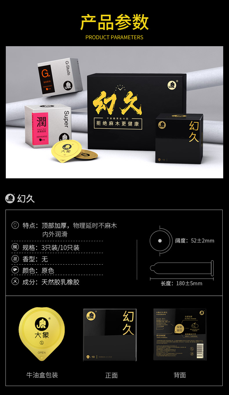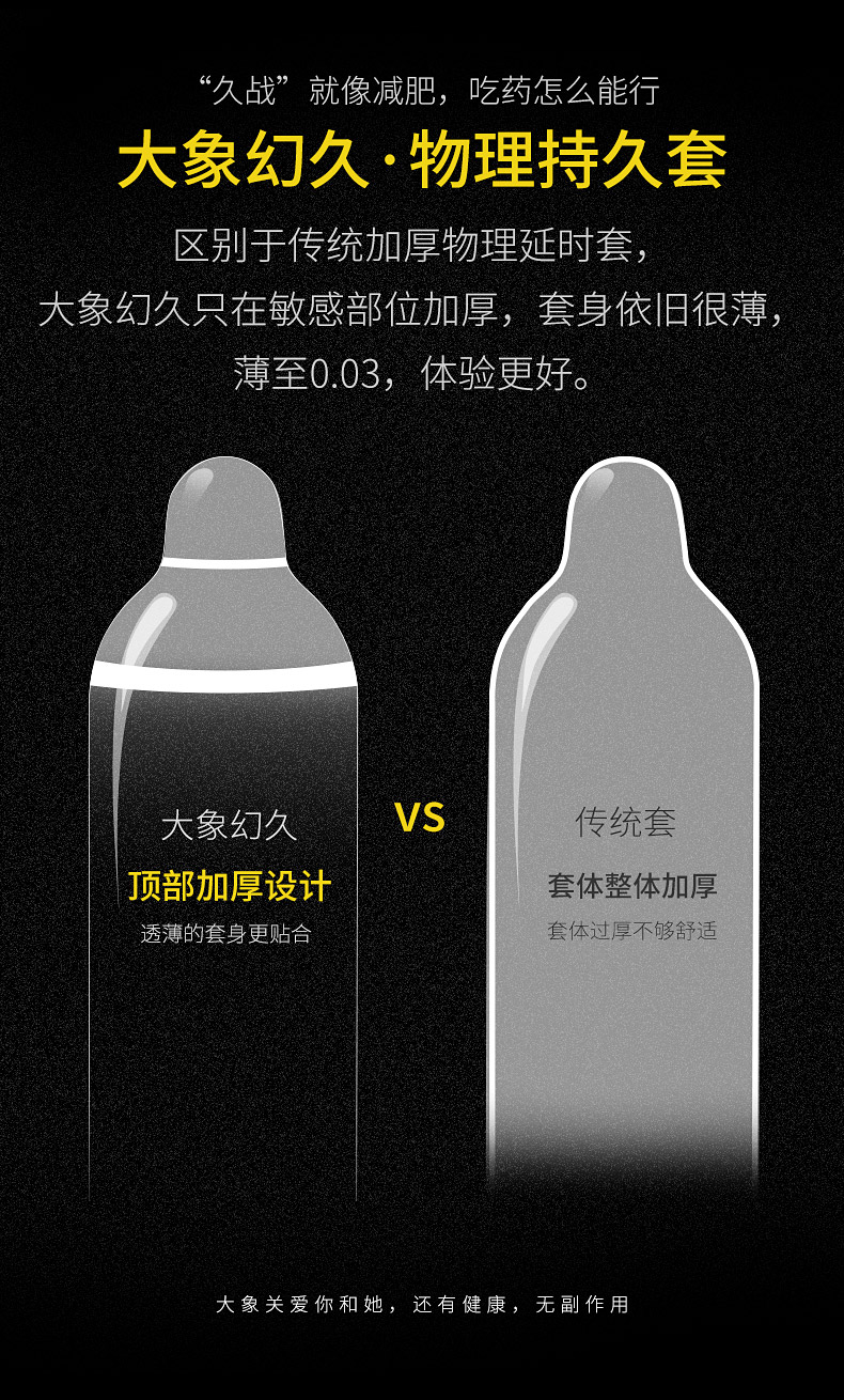 这款幻久003避孕套是大象最新开发的一款套套,采用纯物理延时,减少了对苯佐卡因的依赖,在套套顶部做了加厚设计,让你的小兄弟受的刺激轻一点,从而达到持久的效果,套身依旧薄至0.03,不影响舒适体验。