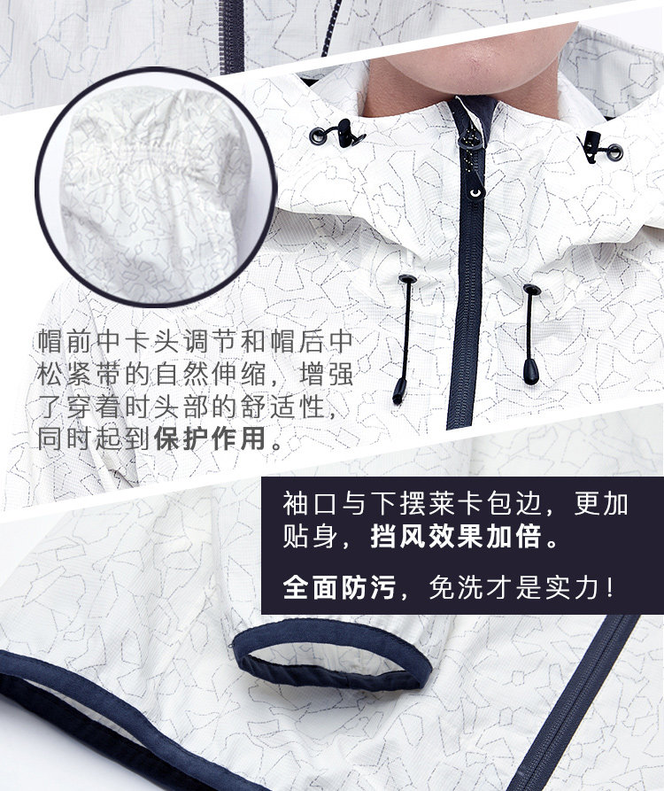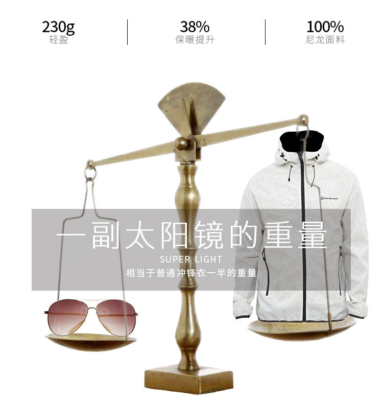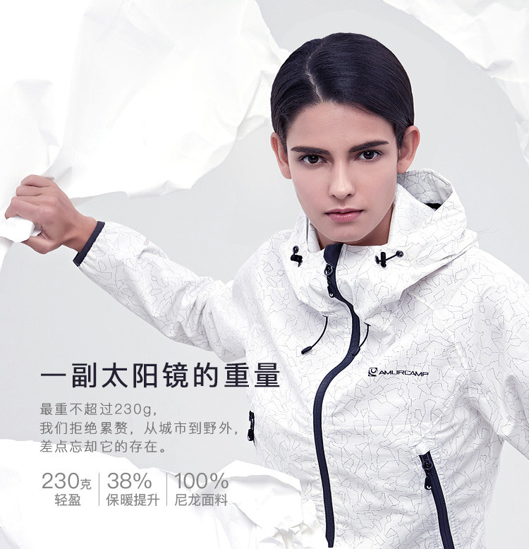 Amurcamp纸感冲锋衣,把冲锋衣的功能做到风衣的重量,使用新颖的纸感面料,轻薄程度接近于纸,230克重量不到传统冲锋衣的一半,防水指数10000mm可防暴雨,直接当雨衣穿。透气指数高达10000g激烈运动可穿,还拥有UPF 50+的50倍防晒功能。
