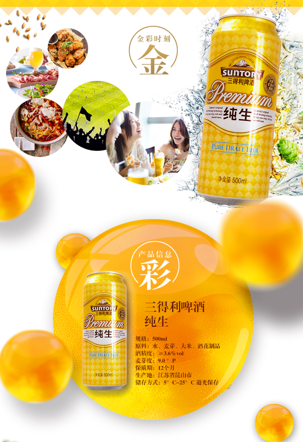 三得利 纯生啤酒,精选优质二棱大麦麦芽,优质啤酒花为原料,采用日本高品质酵母发酵,从原料选择,酿造过程,物流运输,每一环节都有严格的品控标准,以新鲜、纯正、净爽、顺滑的口感,获得广泛消费者喜爱。自1996年三得利啤酒进入上海市场以来,于1999年起位居上海啤酒品牌销量前列。
