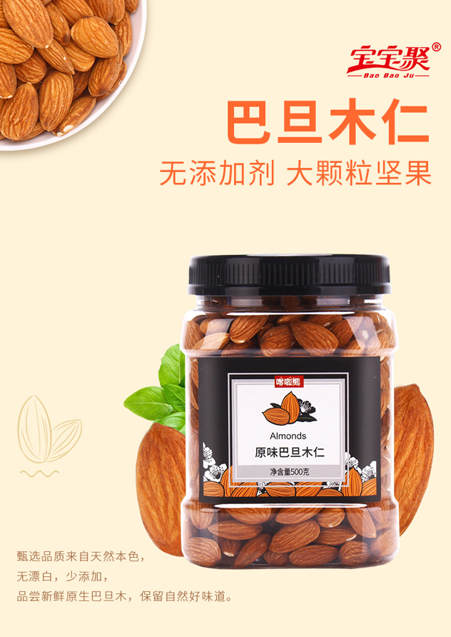 这款宝宝聚 巴旦木仁,选用美国加州NP级别巴旦木仁(巴旦木中质量最好的),经过低温烘焙而成,并非高温油炸,口感好,留有自然香,果实饱满、大小均匀,香脆可口,营养美味。可直接零食吃,也可以用来做坚果制品,无添加、无漂白,规格是550g罐装。