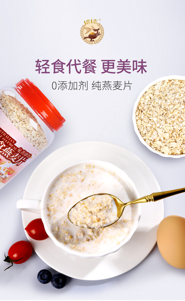这款优佳纯燕麦片,使用澳洲进口燕麦片,0添加剂成分,无香精、色素、防雾剂,安全健康,高膳食纤维易饱腹,即食冲饮即可。