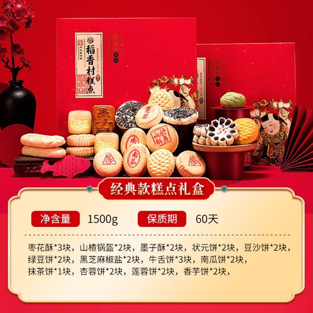 天猫稻香村工坊旗舰店89元,可领30元优惠券,实付59元到手,1500g礼盒此价,包含十几种经典糕点,详细可参考下图;此外还有2000g、3000g礼盒可选,忌糖人群可选无蔗糖礼盒,略有差价。