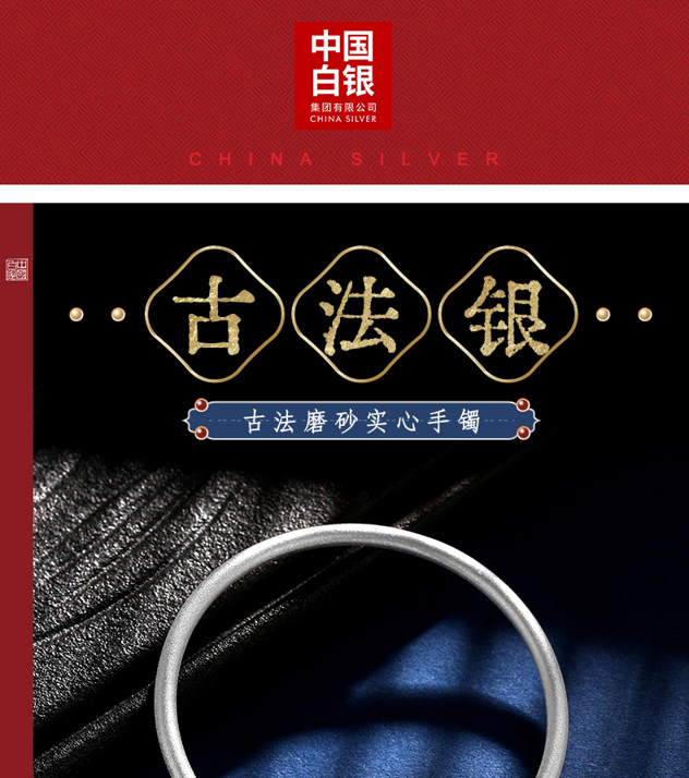中国白银集团有限公司 女士999千足银磨砂手镯不加以浓墨重彩,越繁杂而回归的自然美,别有韵味。采用中国古法银手工技艺,将古法技艺与传统文化相交融。千年古法手工银器,传承中华经典匠心精神。诠释优雅、质朴且精巧的银饰东方美学、成就质感美物,赋传统文化之魂。