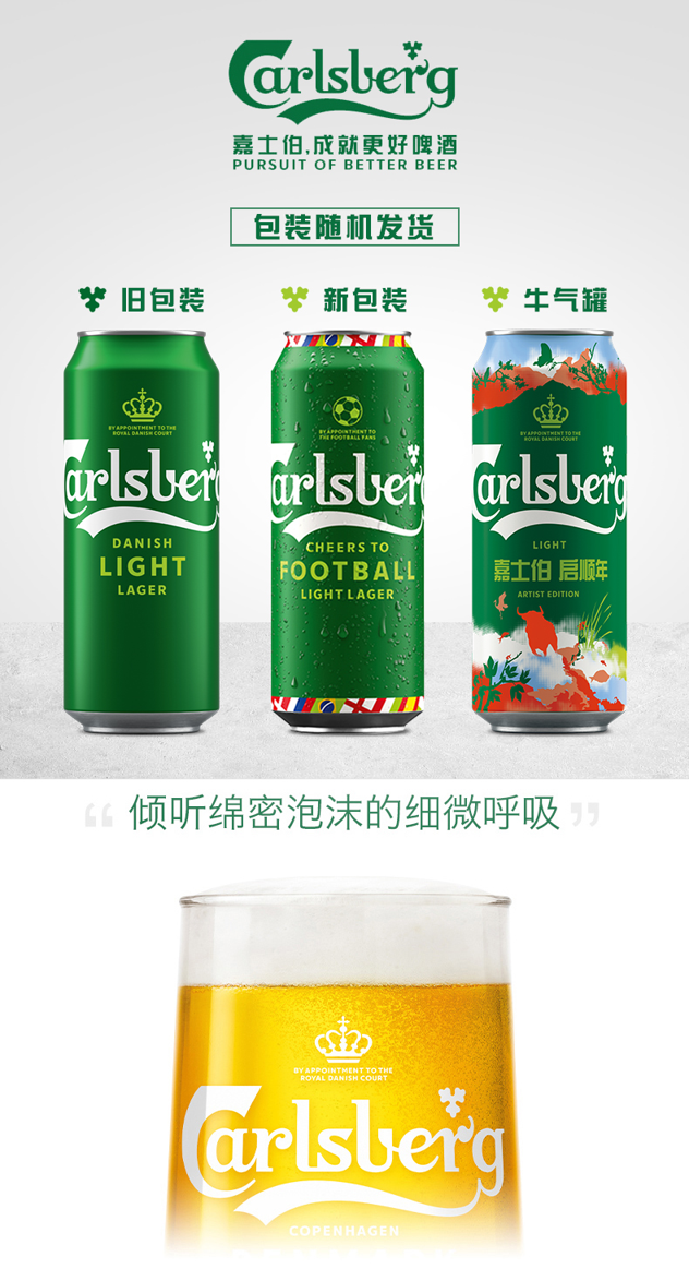 嘉士伯是丹麦著名的啤酒品牌,从1904年开始,被丹麦皇室指定为御用啤酒,其商标上多了一个皇冠的标志,这在国外是很高的荣誉了,特醇嘉士伯啤酒,精选优质小麦,口感香醇顺滑,让你一喝上瘾~丰富泡沫。