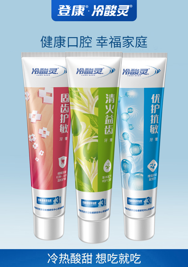 这款冷酸灵清火菌衡抗敏感牙膏 ,采用双重抗敏感中国发明专利配方,有效舒缓食物引起的牙齿敏感和酸痛现象。