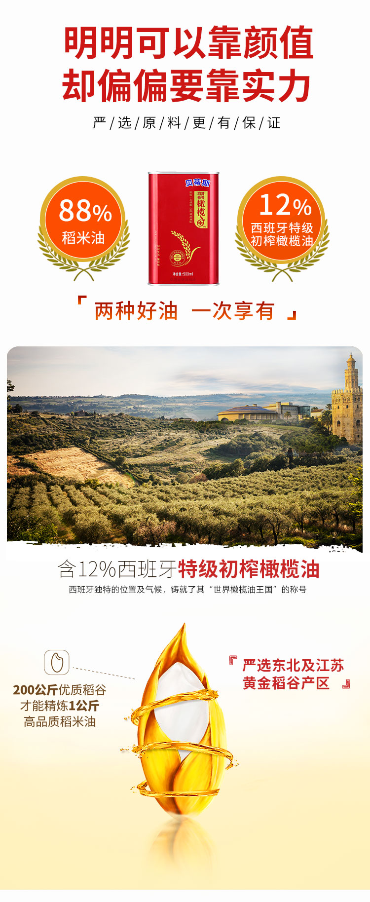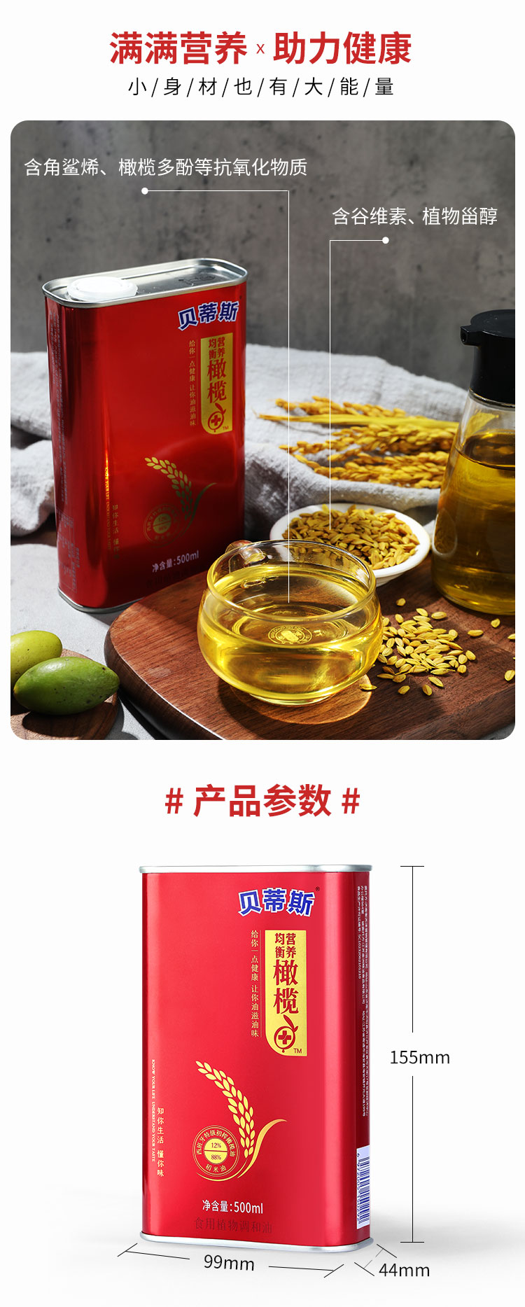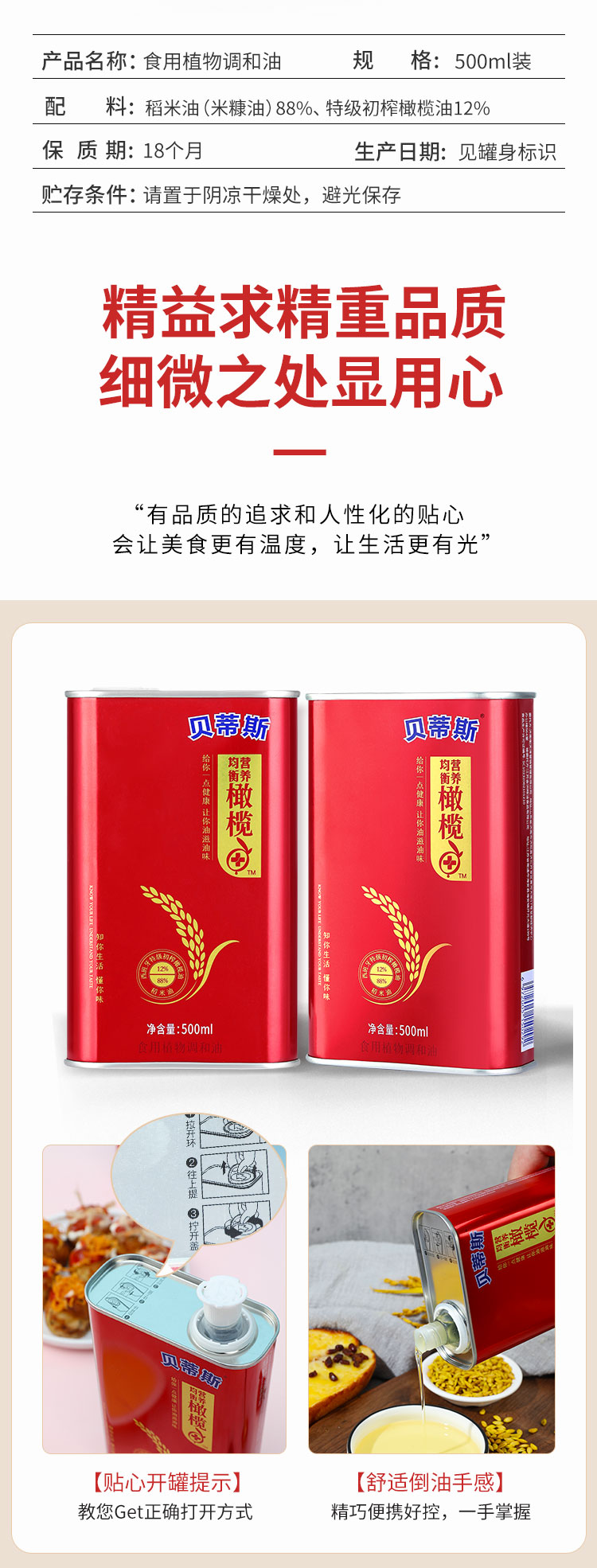 这款贝蒂斯 稻米橄榄调和油,是一款食用植物调和油,由12%西班牙特级初榨橄榄油+88%稻米油调和而成,含大量的不饱和脂肪酸矿物质元素,还富含维生素A、B1、E等。油质色泽清亮,少油烟,使用健康。