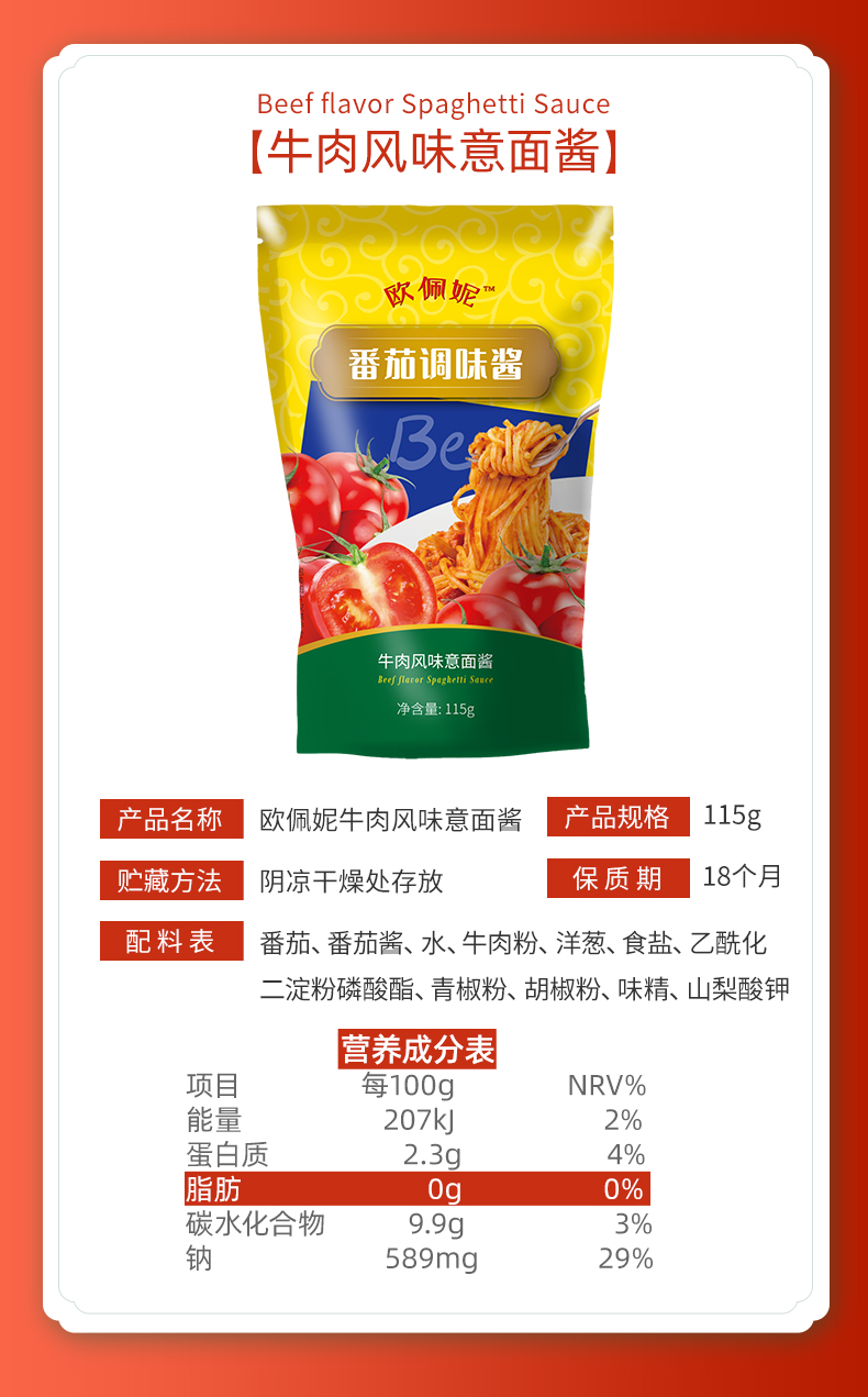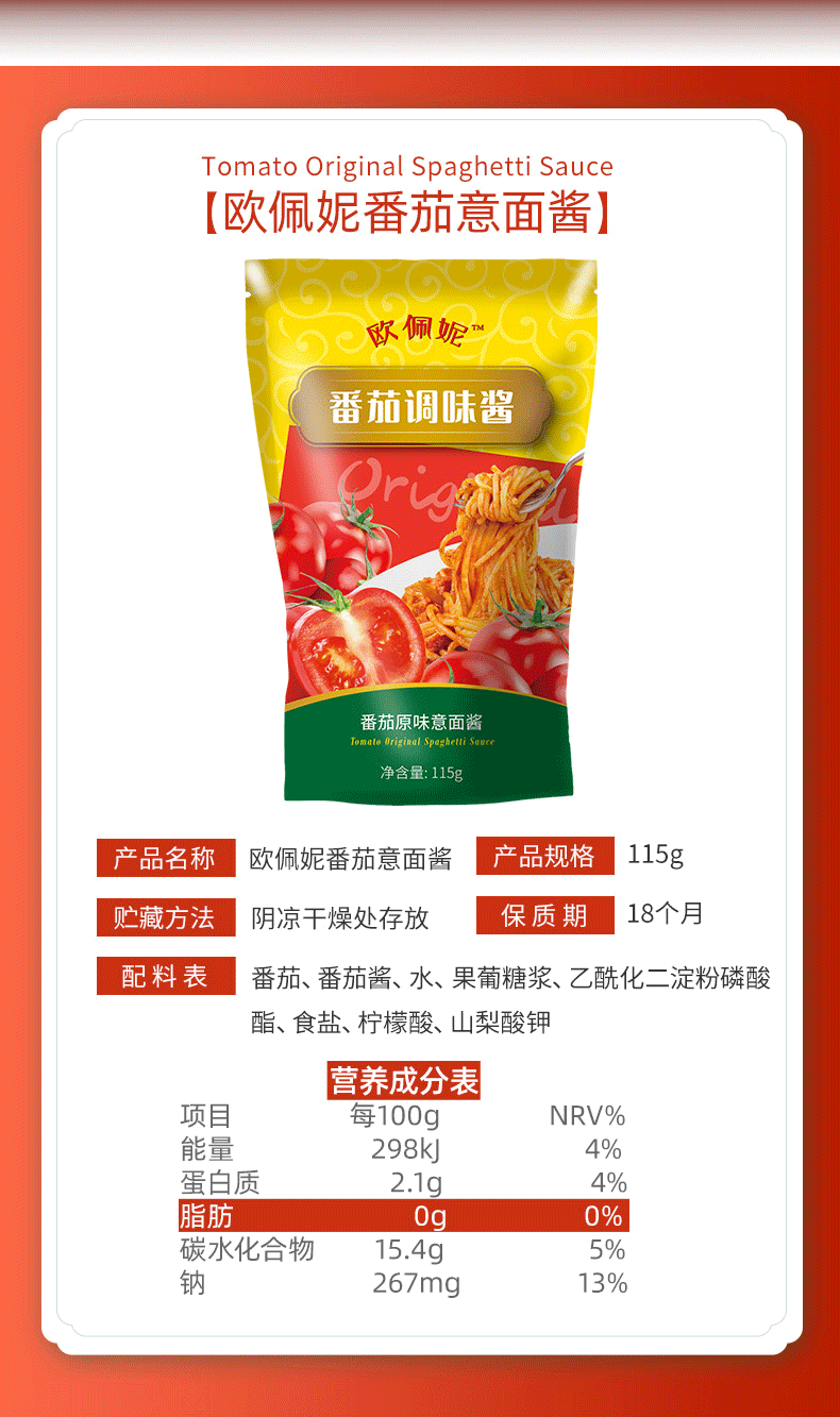 这款欧佩妮意大利面酱零脂肪含量,适合减肥健身爱好者,使用新鲜优质原料制成,不添加人工防腐剂、色素、淀粉、增稠剂,无油工艺,最后巴氏杀菌罐装,健康又安全。