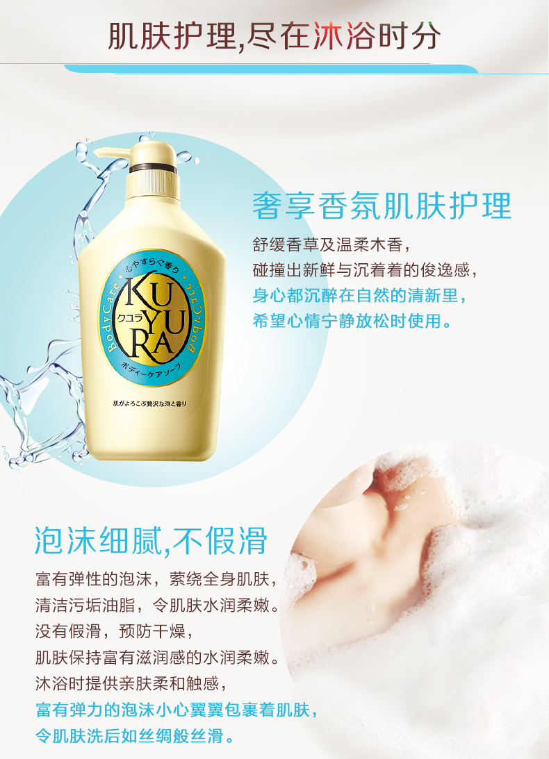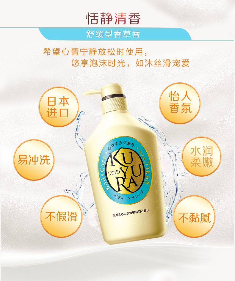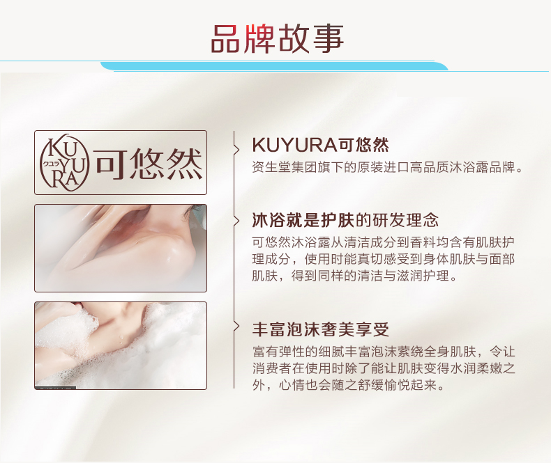 可悠然KUYURA,是资生堂集团旗下的原装进口沐浴露品牌,创立于2008年,含有肌肤护理成分的香芬及泡沫萦绕全身并清洁肌肤,让身体肌肤拥有与面部肌肤同等级别的护理。