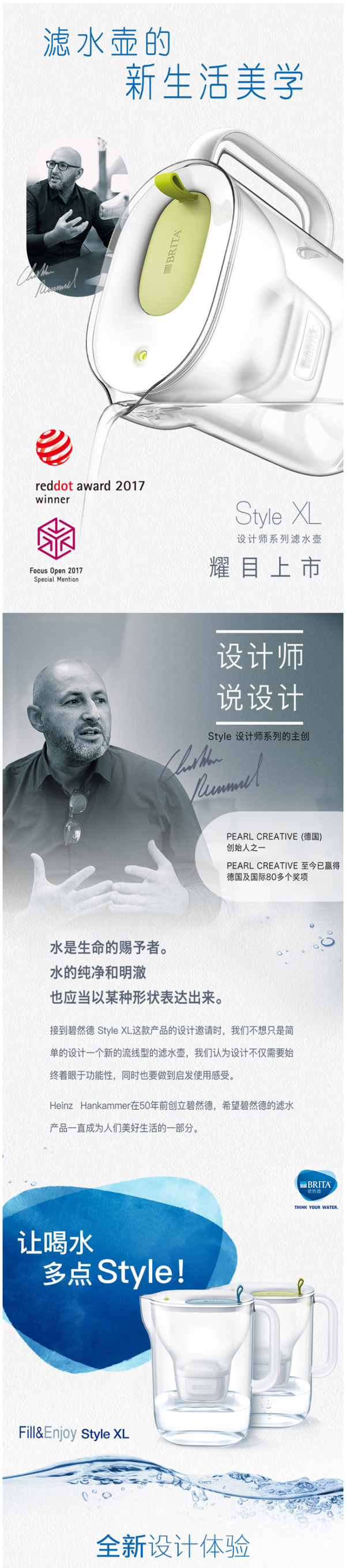 德国的Brita碧然德是过滤水系统行业的领头羊。这款碧然德 Style设计师系列的净水壶,是2017年红点奖作品,颜值比普通系列高很多,搭配的也是去水垢加强版滤芯。据网友反馈,壶身比经典款的薄、软,滤芯是国产的。