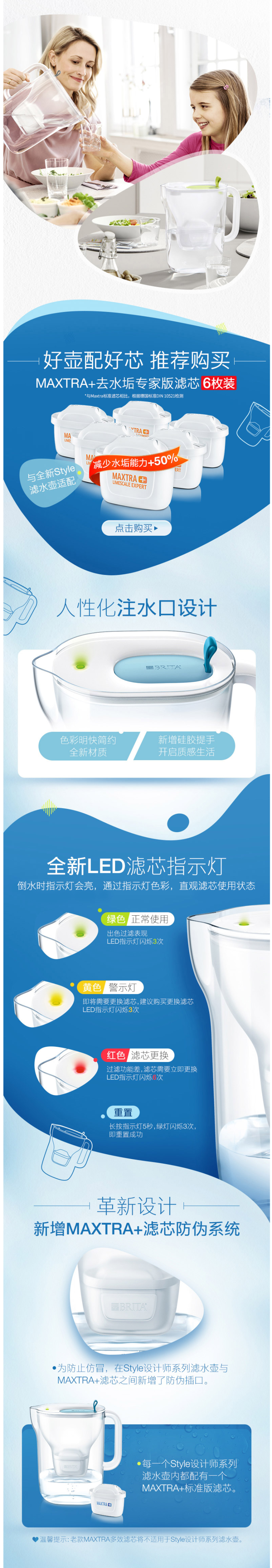 这款碧然德 Style系列滤水壶容量为3.5L,每次可过滤2L,采用BPA-Free无毒塑料,防滑手柄;壶身倾斜水自动流出,在注水口处新增了硅胶提手,注水更方便。全新的LED指示灯,很直观的观察滤芯使用状态。