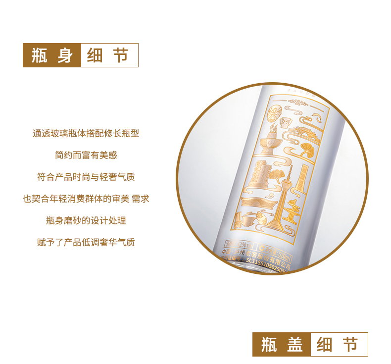 这款老窖藏品 窖响,包装精美异常,通透玻璃瓶搭配修长瓶身,瓶身磨砂处理,瓶身融入了川味十足的脸谱、火锅、熊猫、茶馆等元素,产品外盒以浅灰色做基基底,与充满质感的淡金交叠,方正立体的几何外形,低调奢华。