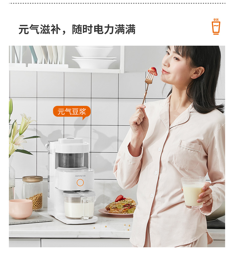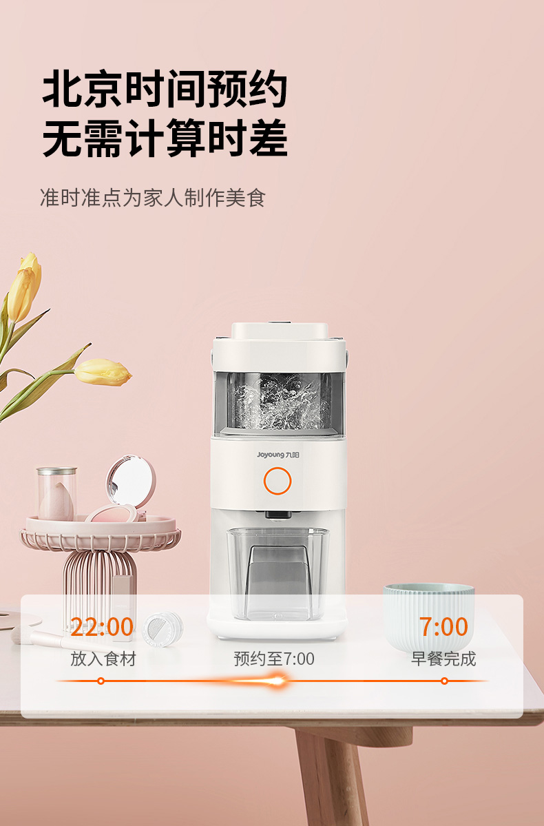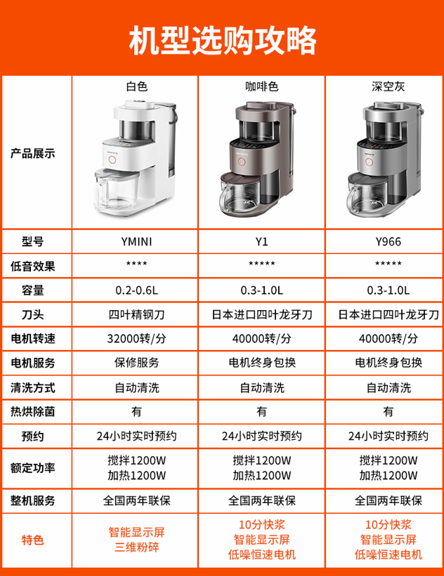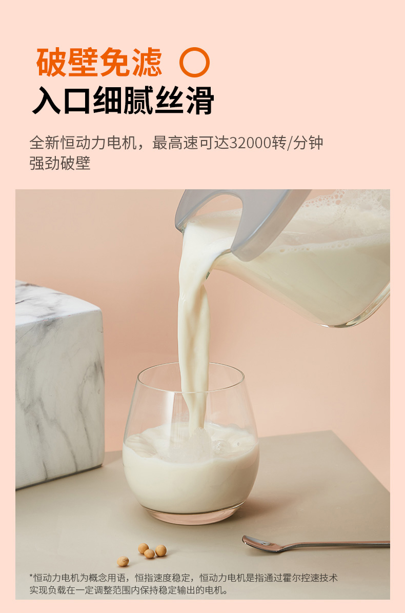 全新恒动力电机,转数稳定噪音低,最高可达32000转/分钟,强劲破壁,无渣免滤,整体框式结构,包围声源,多维降噪,使用体验更舒适;同时还有预约的功能,晚上放入豆子和水,豆水分离,早上直接开动,醒来就能喝,更为方便。