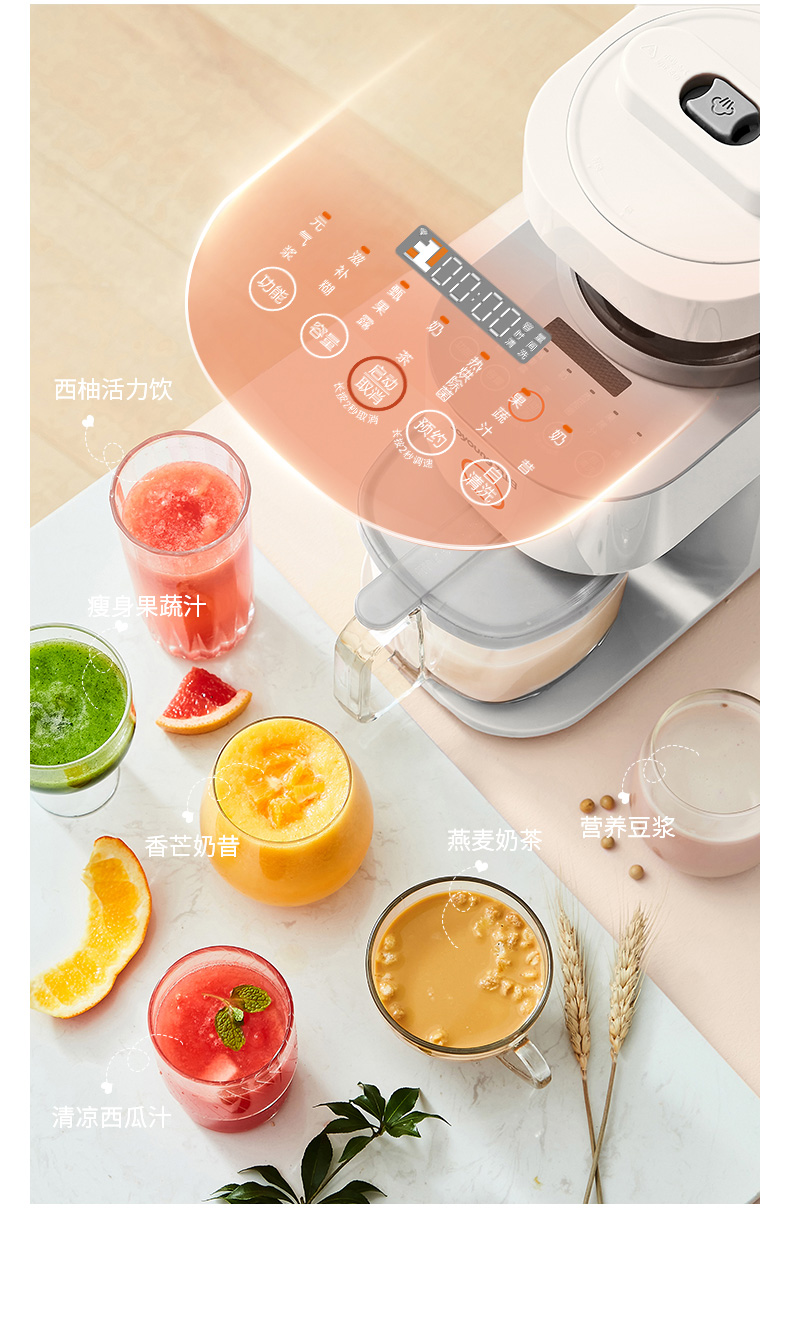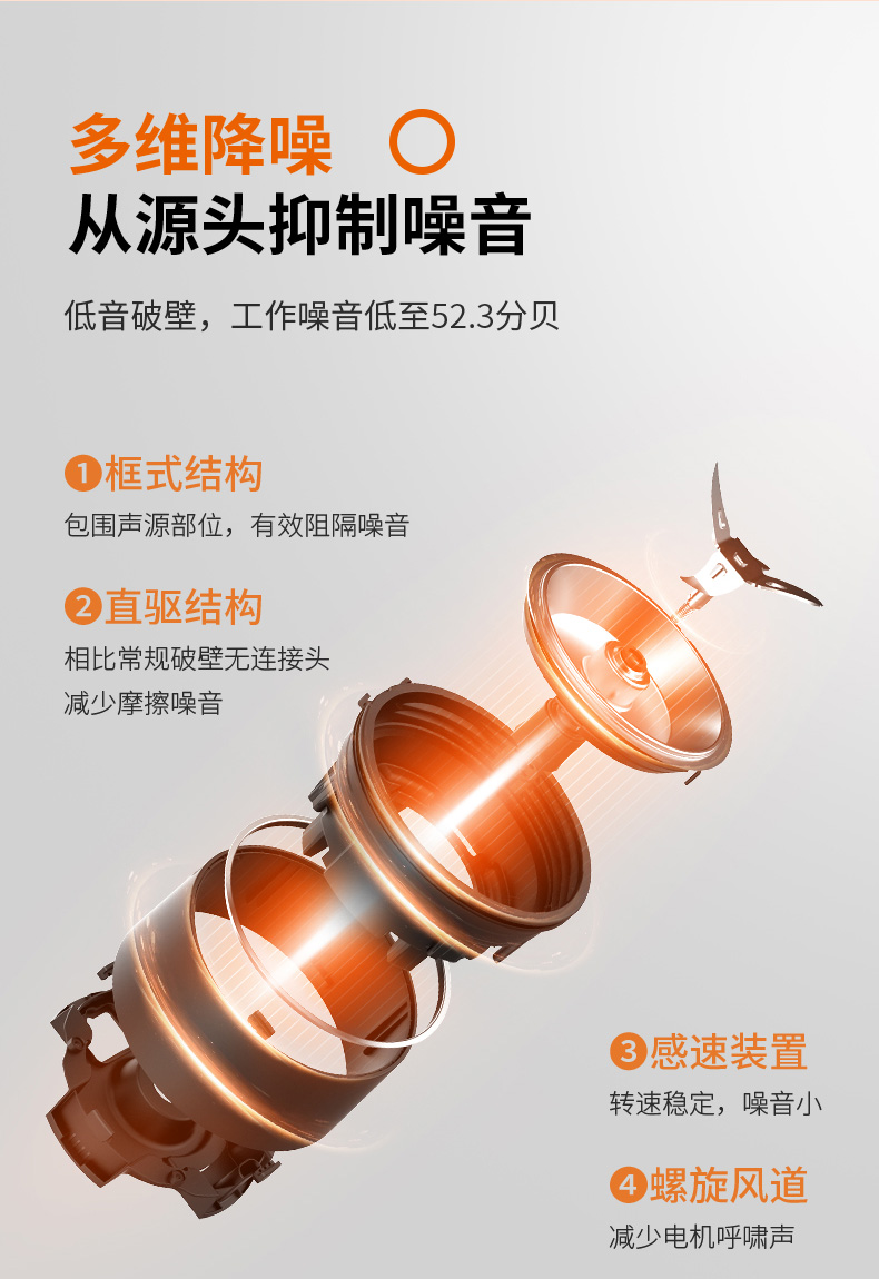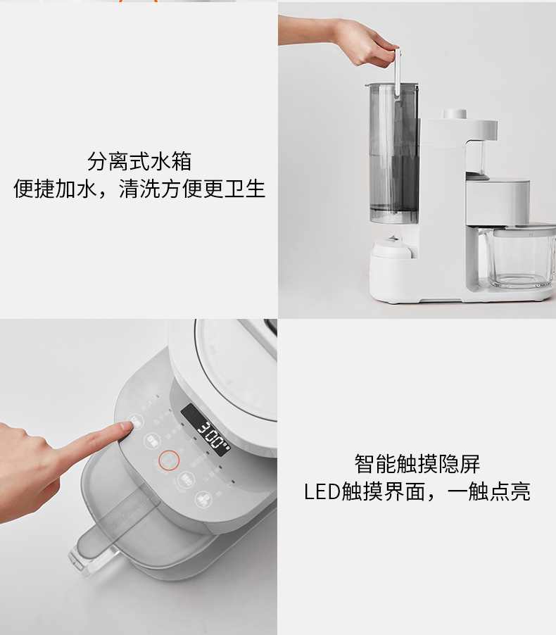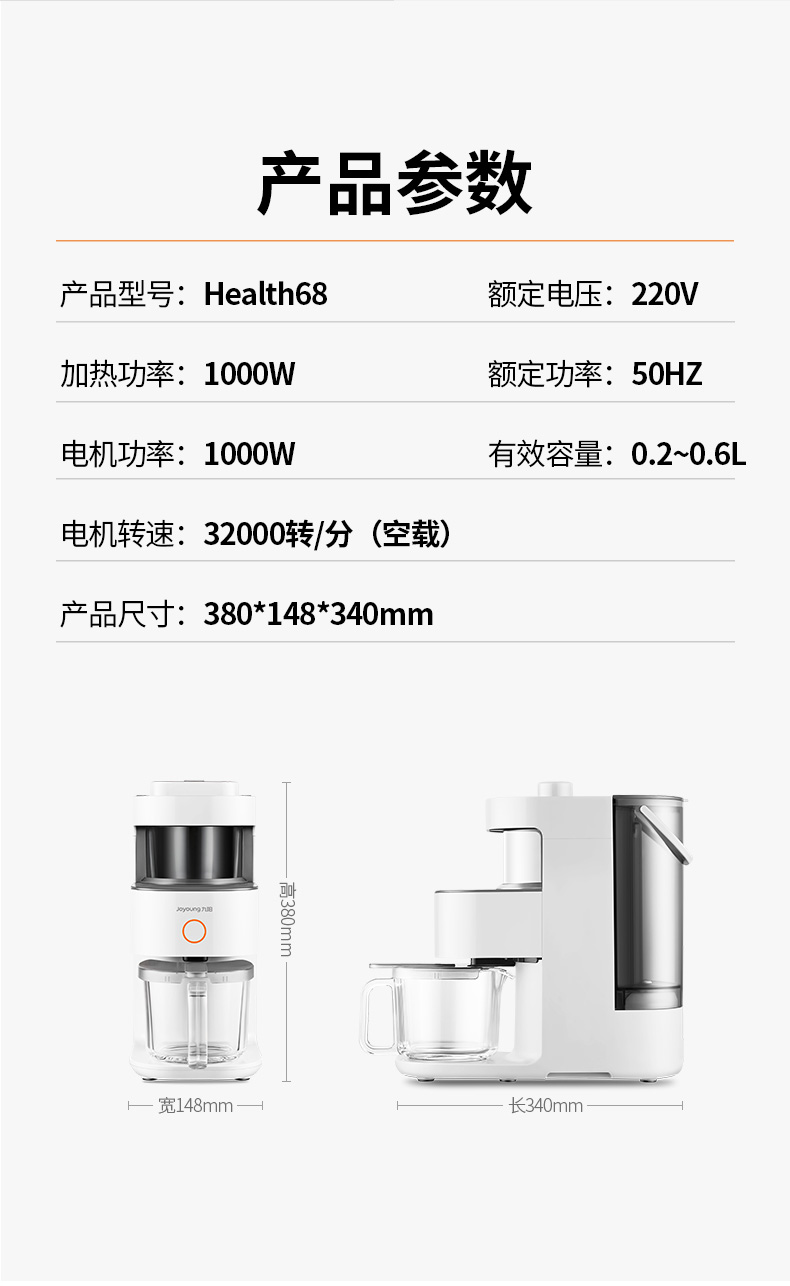 全新恒动力电机,转数稳定噪音低,最高可达32000转/分钟,强劲破壁,无渣免滤,整体框式结构,包围声源,多维降噪,使用体验更舒适;同时还有预约的功能,晚上放入豆子和水,豆水分离,早上直接开动,醒来就能喝,更为方便。