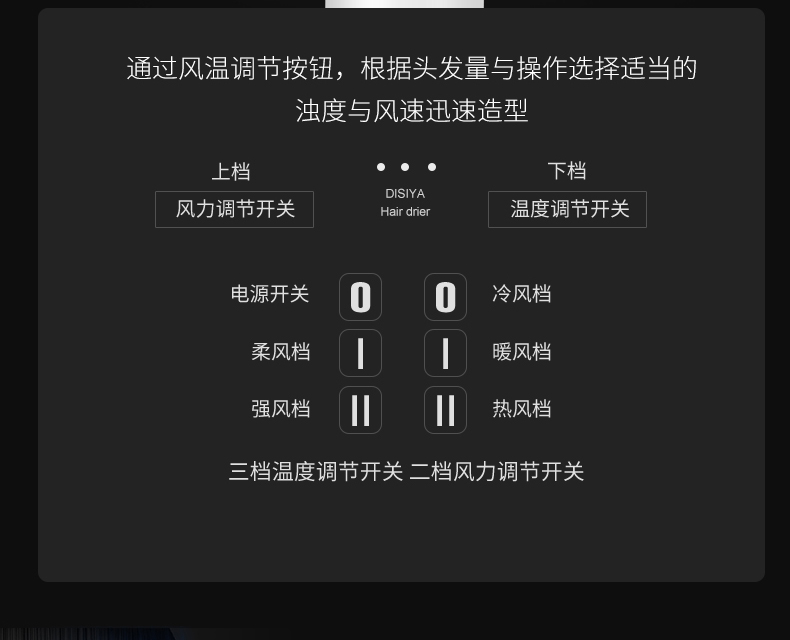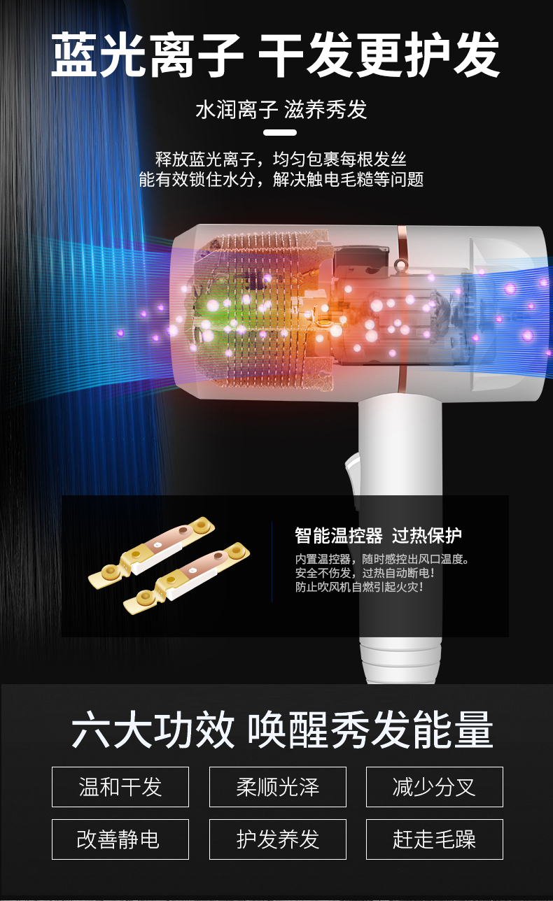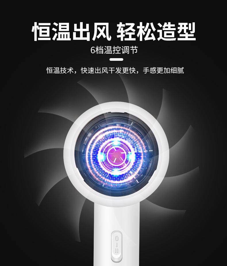 此款 闪格 蓝光负离子护发电吹风,具备6档温控调节,120s秒快速干发,恒温出风,轻松造型,热量均匀分布,水润离子更护发,让发更柔顺有光泽。