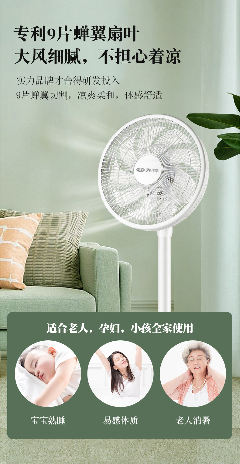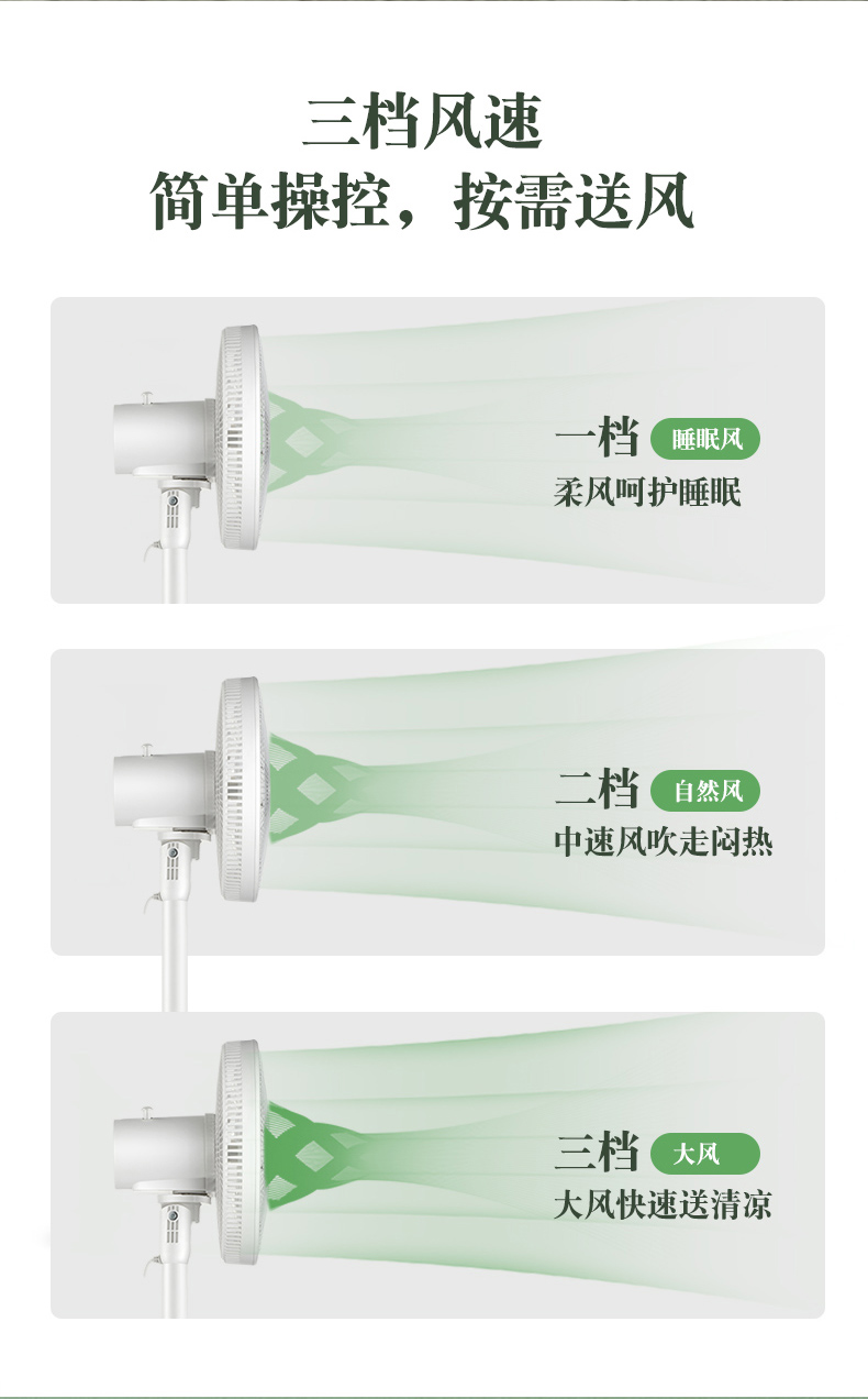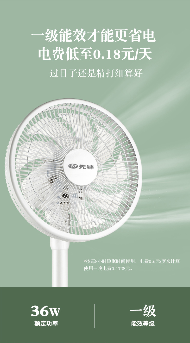 使用铝壳铜线电机,运行时噪声小,质量保修10年。拥有强劲风、清凉风、睡眠风三档风,当开启睡眠风时,噪声仅有30db,不扰人。左右45°自然摆头,上16°、下8°自由手动调节,四方位多角度送风,1级能效。