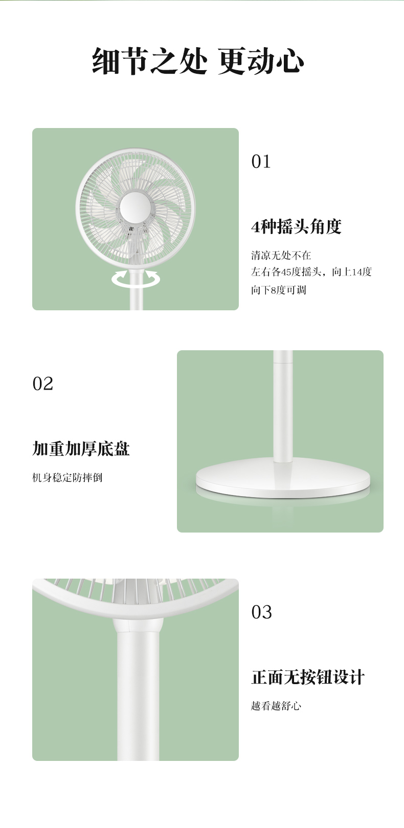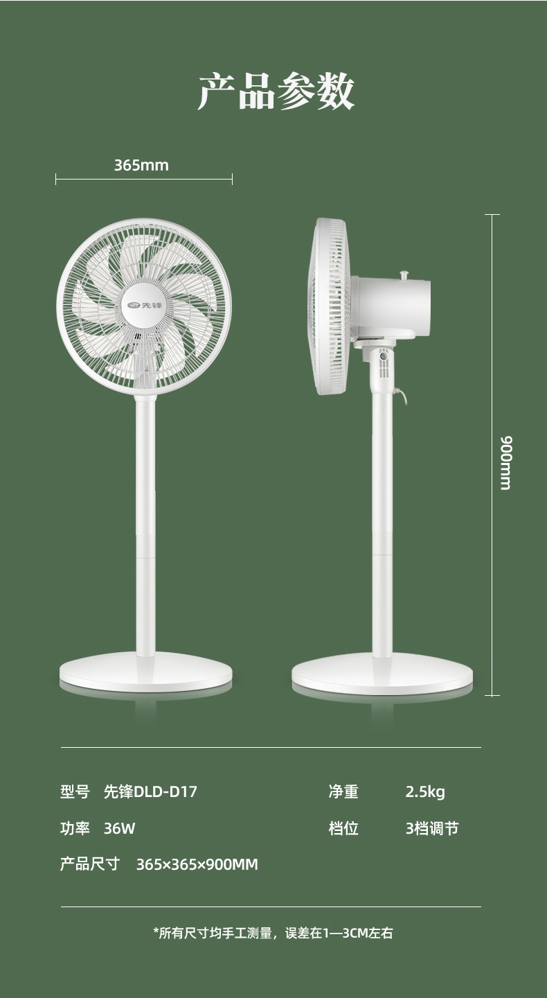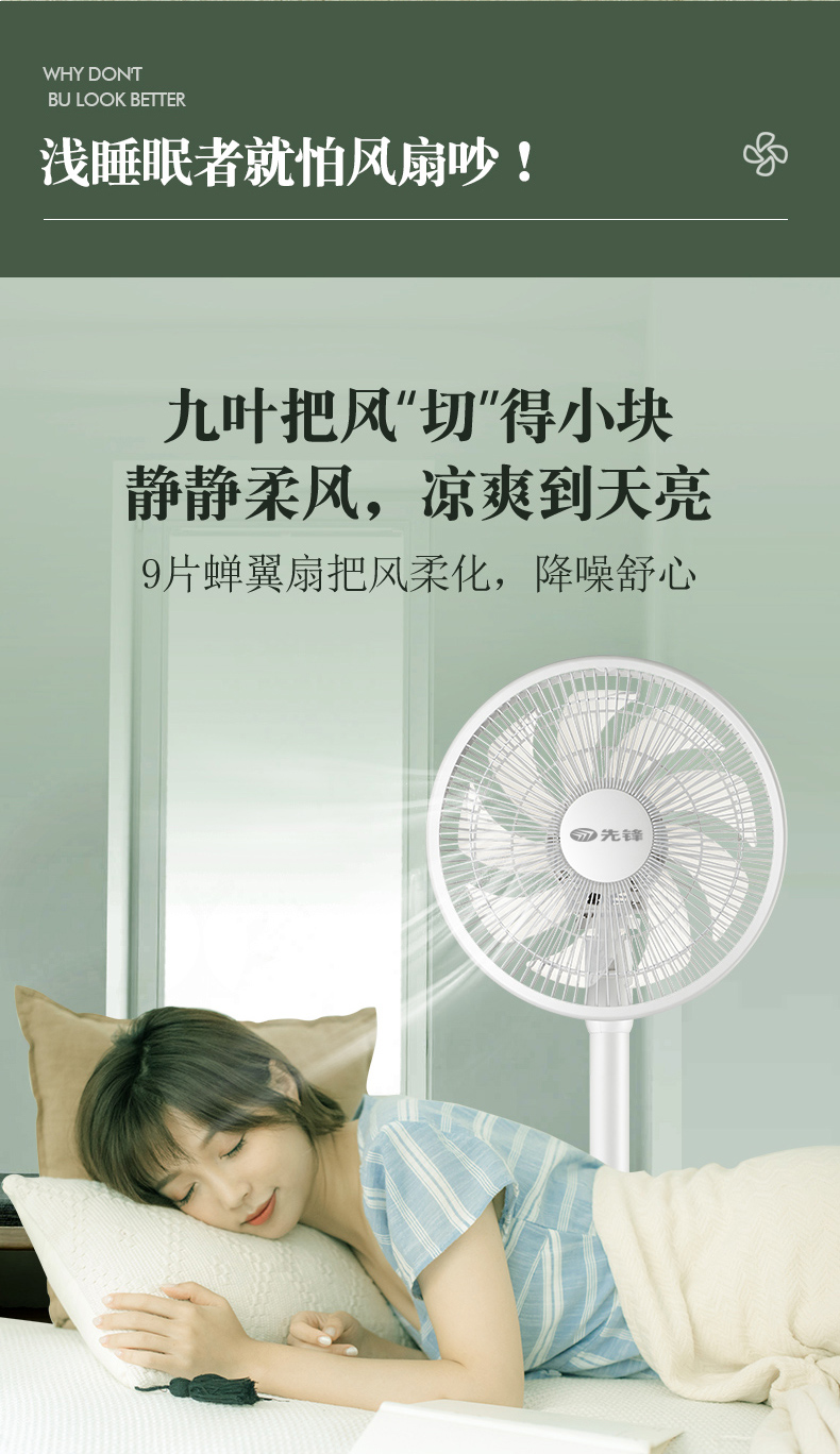 使用铝壳铜线电机,运行时噪声小,质量保修10年。拥有强劲风、清凉风、睡眠风三档风,当开启睡眠风时,噪声仅有30db,不扰人。左右45°自然摆头,上16°、下8°自由手动调节,四方位多角度送风,1级能效。