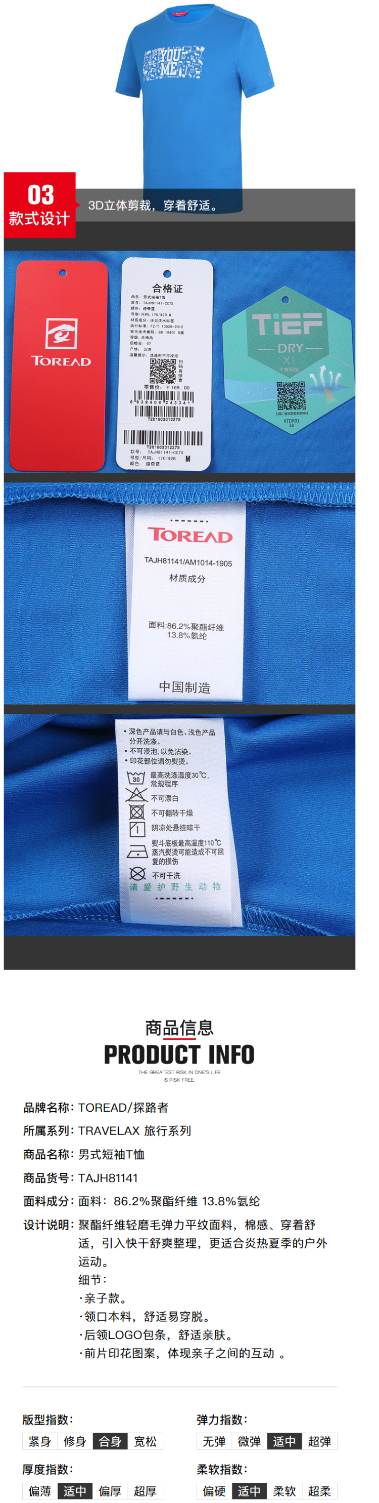 这款探路者 男速干印花透气T恤,使用棉感平纹面料—86.2%聚酯纤维+13.8%氨纶混纺,摸起来手感接近纯棉,穿着更舒适。功能上吸湿排汗,速干透气,弹力不束身,适用于夏季或运动时穿。