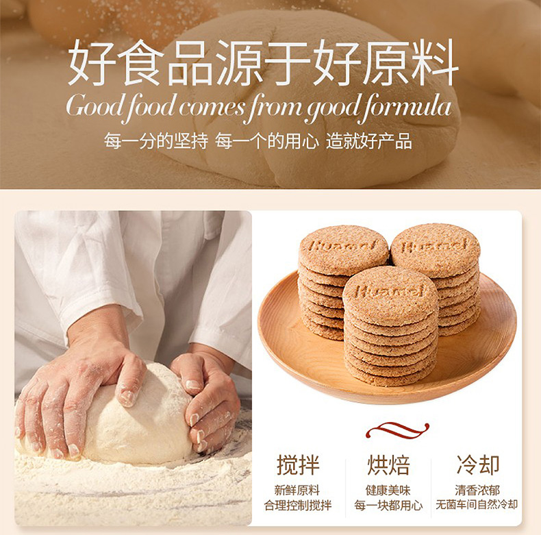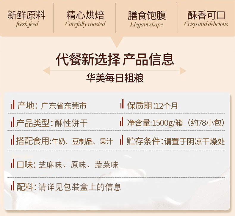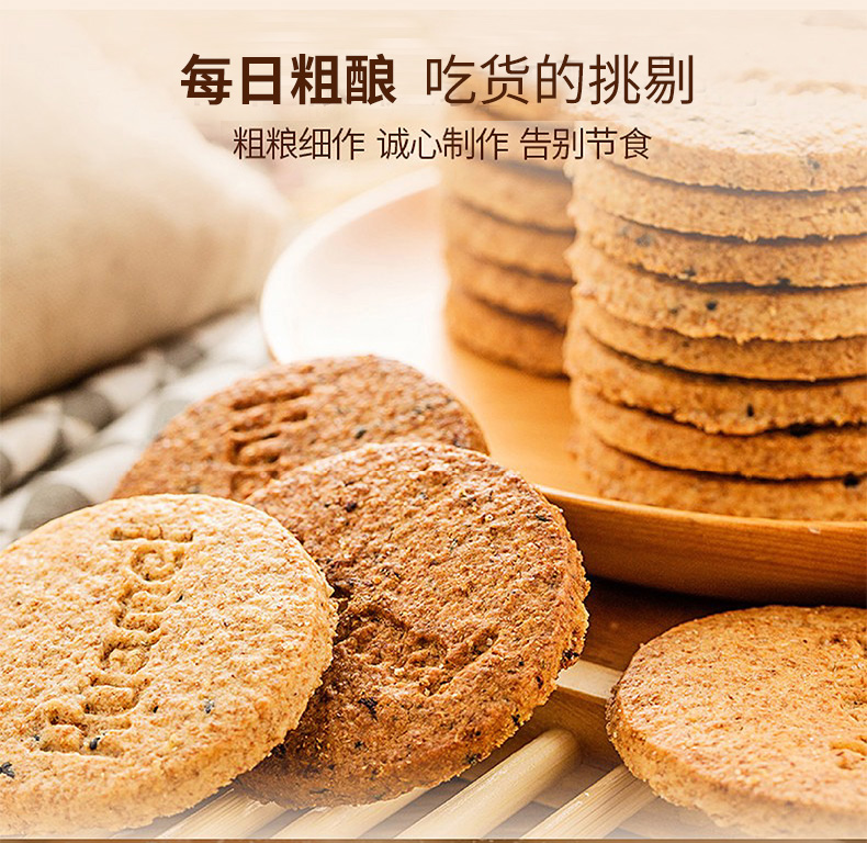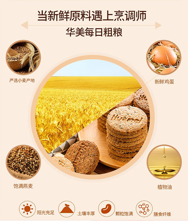 这款华美 粗粮饼干,全麦粉、燕麦、鸡蛋、黑芝麻、小麦麸皮、淀粉、乳粉、植物油等制成,饼干中含有丰富的维生素、微量元素和膳食纤维,对人体有益,不添加蔗糖款,糖尿病人也能食用,健身爱好者也可以,易增强饱腹感,脂肪含量低。
