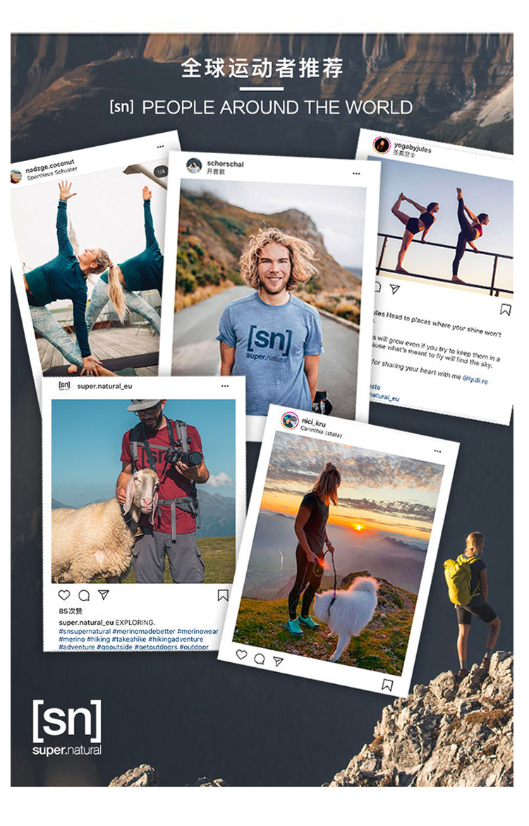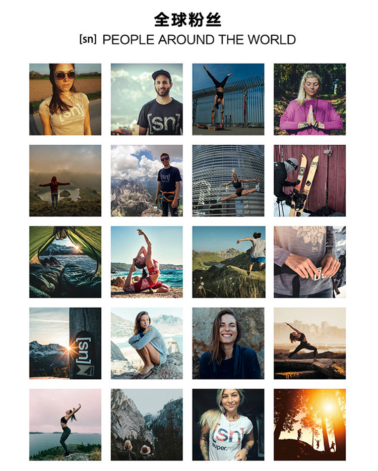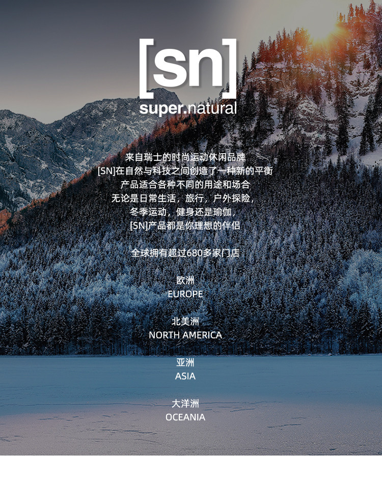 [SN]是Super.Natural的缩写,是一个来自瑞士的时尚运动休闲品牌,专注于城市运动和时尚休闲服装。其产品设计均来自欧洲,而面料则是其品牌的核心组成部分,注重高科技面料带来的衣着感受,在全球拥有超过680多家门店。