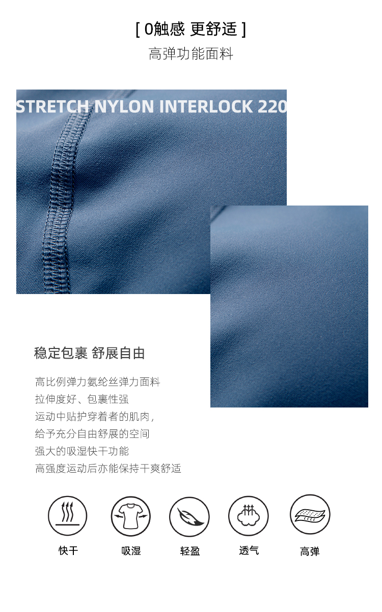 在设计上,高比例弹力氨纶丝弹力面料拥有拉伸度好、包裹性强的特点,能在运动中贴护穿着者的肌肉,给予充分自由舒展的空间,同时强大的吸湿快干功能,在高强度运动后亦能保持身体干爽舒适。