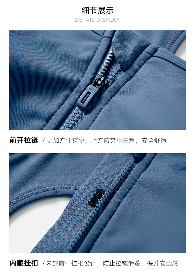 在款式上,根据人体工程学设计的版型,上身无丝毫不适感。前开拉链设计,穿脱方便,拉链顶端有防夹小三角,安全舒适。拉链内部也有小挂钩设计,防止拉链意外滑落,提升安全度。
