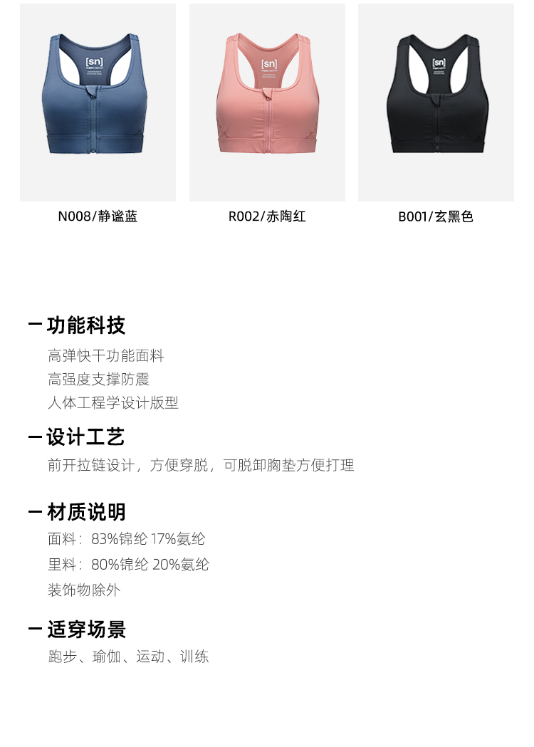 这款SN女高弹运动文胸,是2021年的春夏新款,可以作为健身瑜伽上衣。外面料是83%锦纶+17%氨纶、里面料是80%锦纶+20%氨纶,拥有轻盈透气、吸湿快干、高弹贴身的优点。