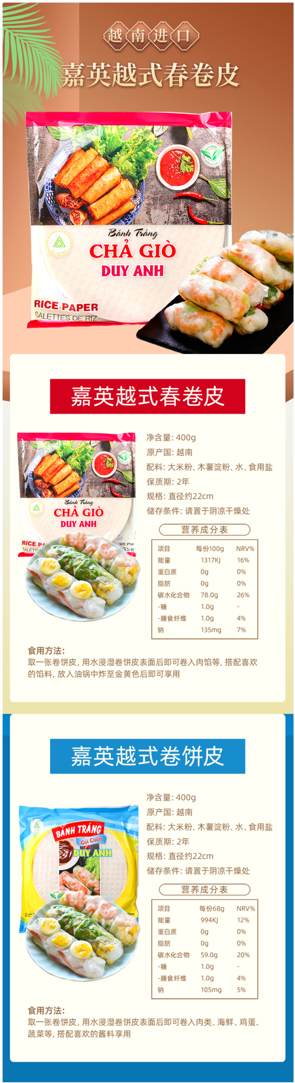 这款嘉英越式春卷皮,产地是越南,由大米粉、木薯淀粉、水、食用盐制成、0脂肪配方,无任何添加剂,晶莹剔透,入口有嚼劲。