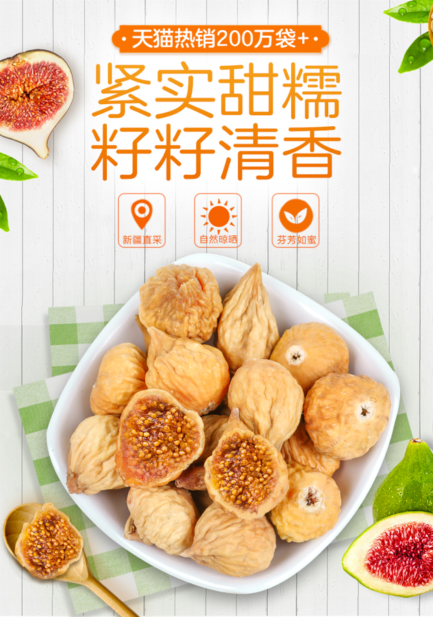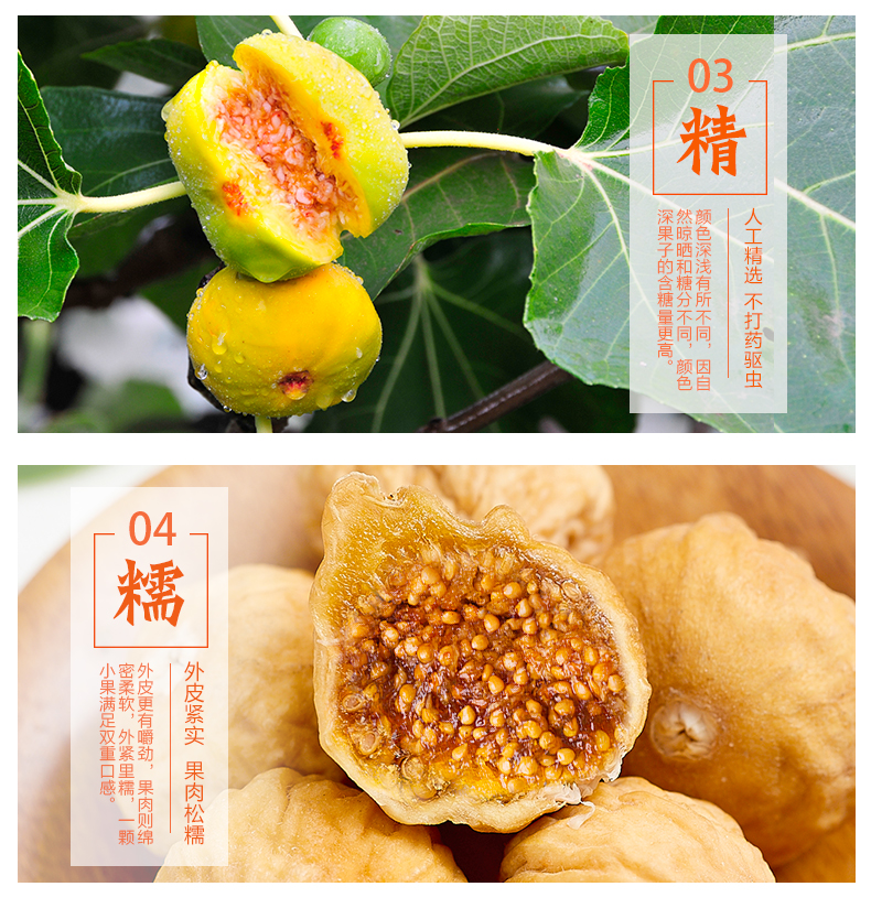 无花果有“树上糖包子”之称,无花果含有丰富的营养成分,其中的苹果酸、柠檬酸、脂肪酶、蛋白酶、水解酶等能帮助人体对食物的消化,促进食欲,还能抗炎消肿降血压,干制后糖份浓缩更加甜哦。