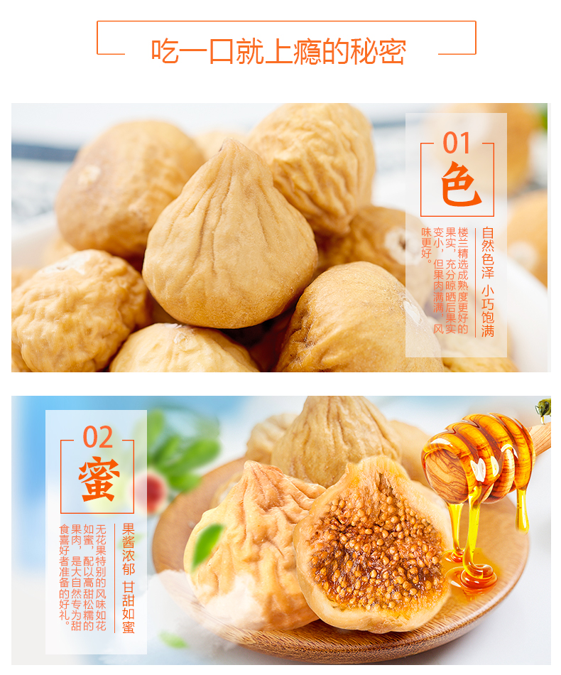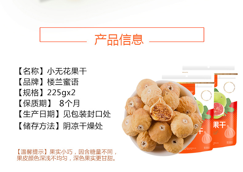这款楼兰蜜语 无花果干,是新疆特产,个头不大,生长过程中未经人工干预,自然生长,日晒充足,成熟后天然晾晒,果皮劲道,果肉软糯,甜度高,无熏染无添加,老少皆宜,可放心食用,规格:225g*2袋