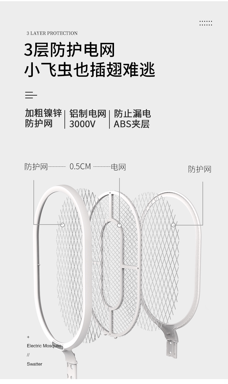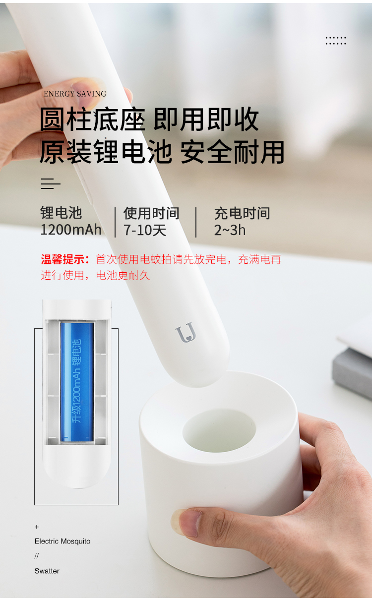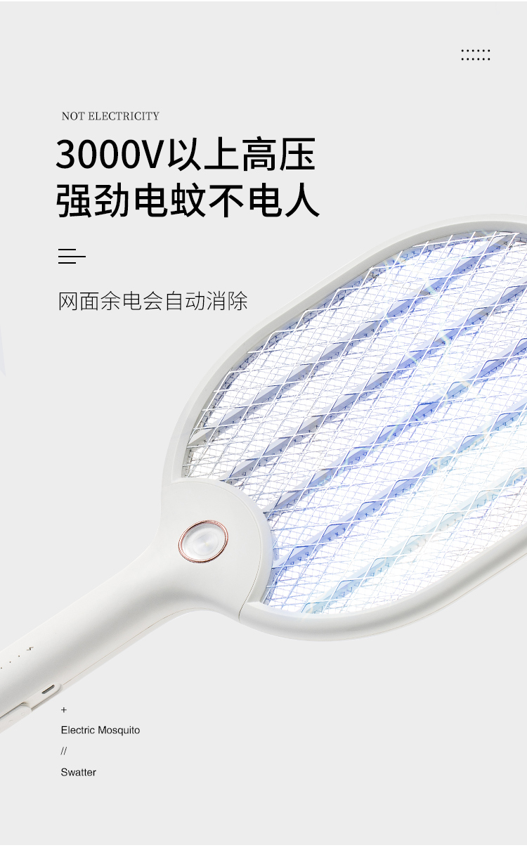 佐敦朱迪充电时简约电蚊拍,3层防护电网再小的虫子都插翅难飞,铝制电网3000v,防止漏电abs夹层,带诱蚊LED灯,led照明灯辅助,双重安全开关设计,1200ah锂电池,续航时间长,usb充电口方便快捷。