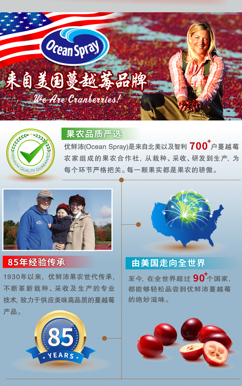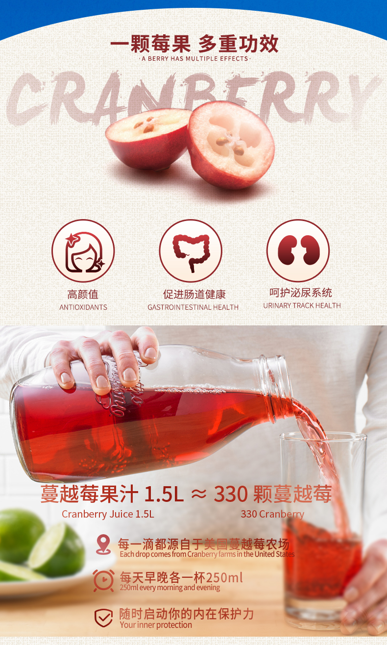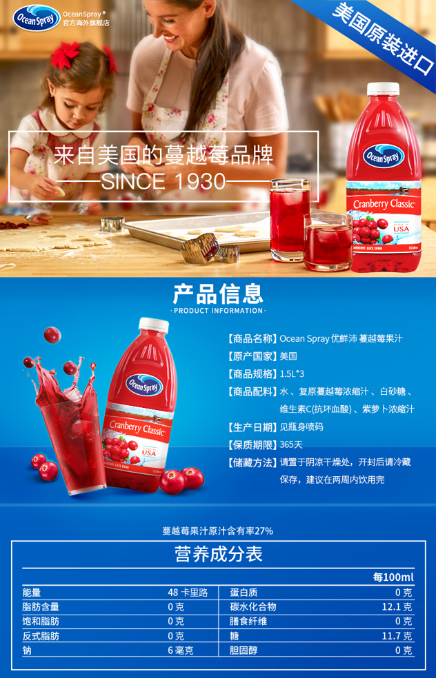 Ocean Spray 优鲜沛是北美著名的蔓越莓供应商,产品行销全球多地,蔓越莓的抗氧化性是各种水果中的翘楚,高于蓝莓,这款优鲜沛的蔓越莓果汁不添加人工色素及防腐剂,口味上用户评价也非常不错。
