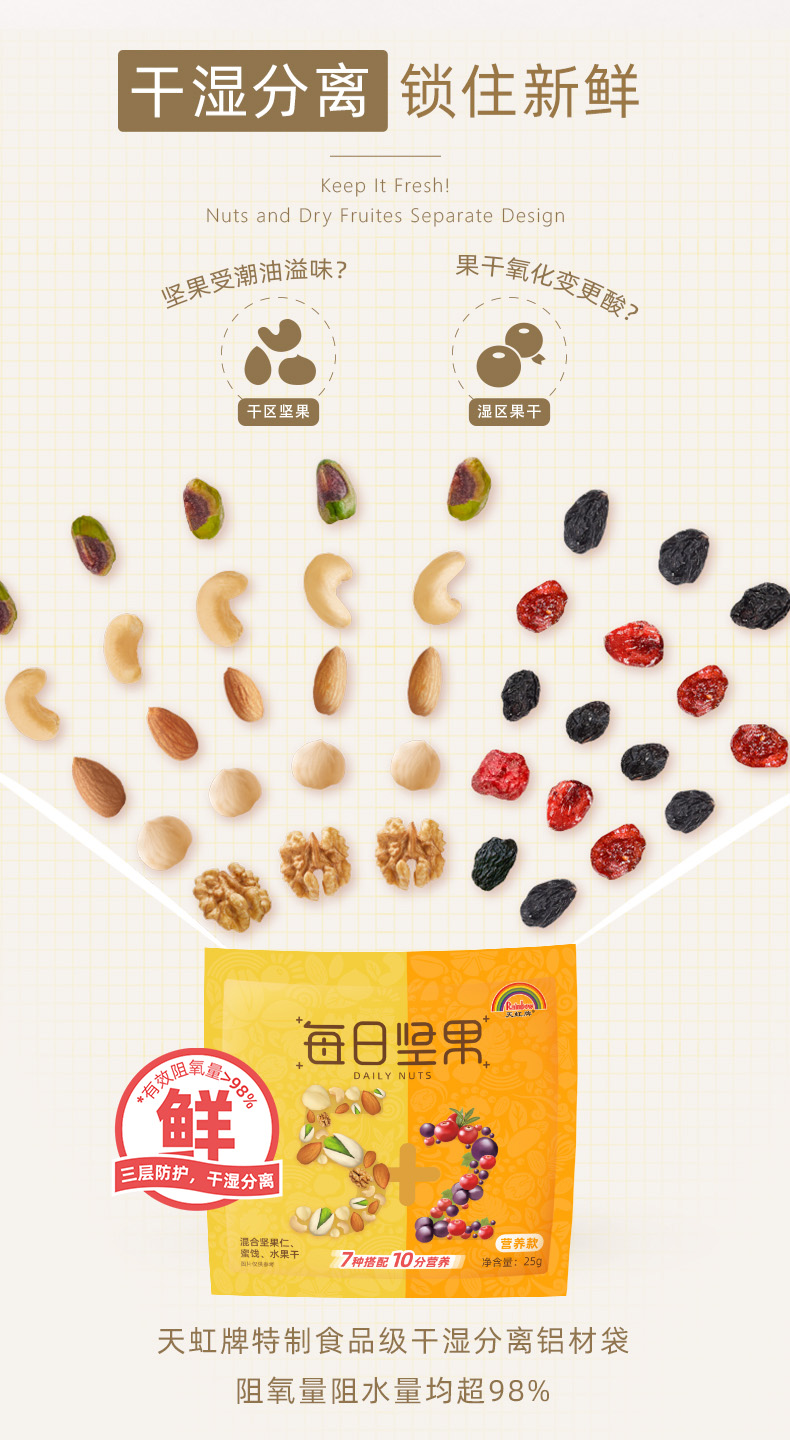 天猫天虹牌食品旗舰店,10-12日国货大赏,¥89.9元 国货大赏价,-2元 下单立减,-20元优惠券,=67.9元 到手价,天虹1958年始创于香港,是一个超60年历史的坚果品牌;这款天虹牌 每日坚果大礼包30袋750g,内含:核桃仁、开心果仁、巴旦木仁、腰果仁、榛子、曼越莓、黑加仑,5+2均衡科学配比,独特的低温烘焙工艺,轻加工,健康更美味。独立锁鲜,干湿分离,营养不串味。
