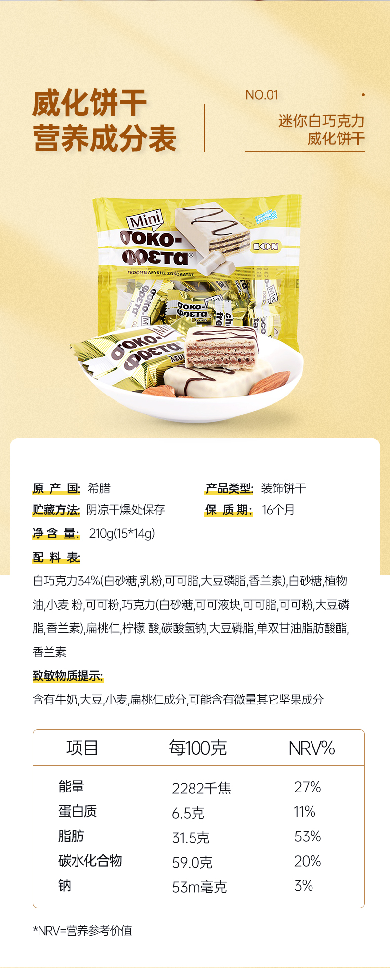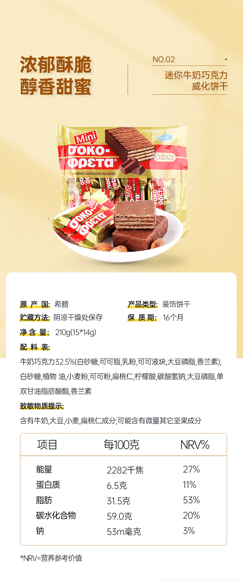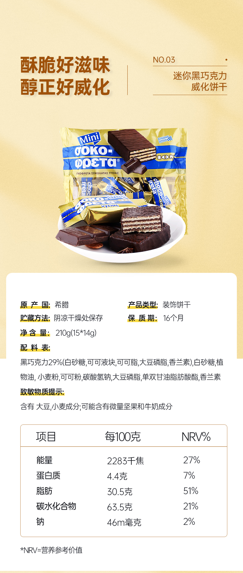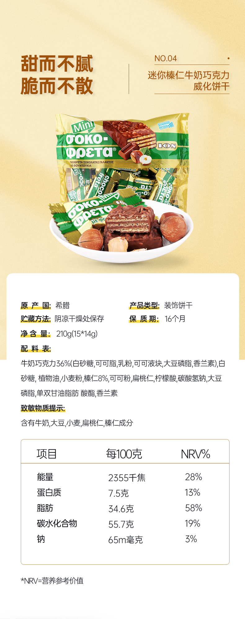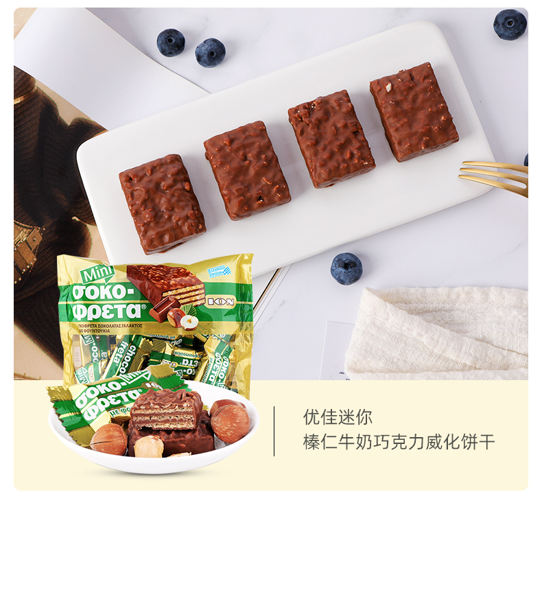 这款优佳 榛仁牛奶巧克力威化饼干,希腊进口,选用优质可可拥有恰到好处的甜度,经典丝滑包裹着威化的香醇酥脆。