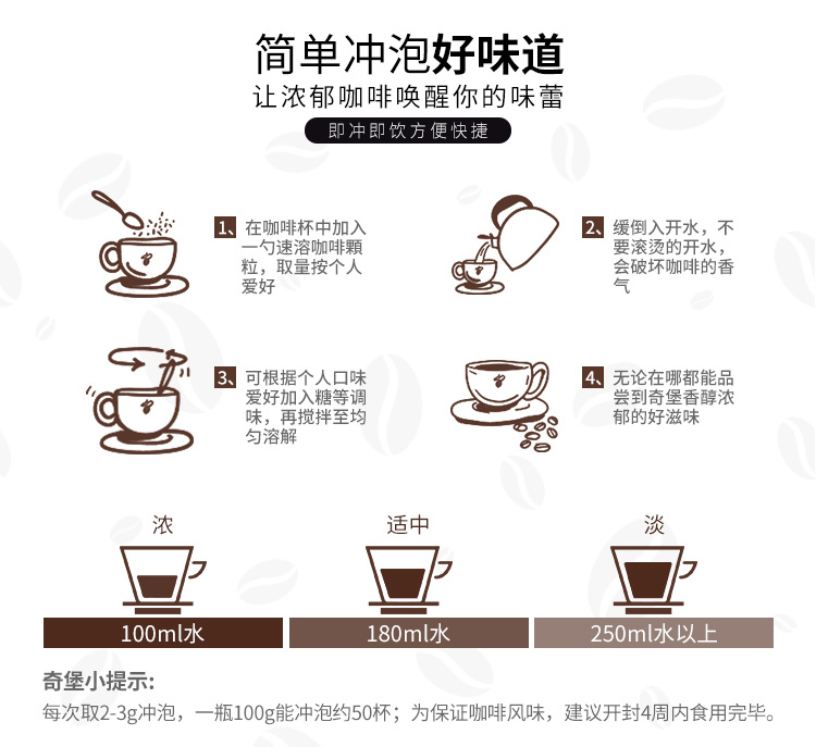 这款黑咖啡严选进口咖啡豆,将高达190℃的萃取物急速冷却至-50℃,充分保留食物中的热敏性物质,冲泡后复原新鲜咖啡的风味,口味经过咖啡大师的精心调校,还经过脱酸处理,适合喜爱香醇浓郁的咖啡爱好者。规格为100g,可冲泡50杯左右。